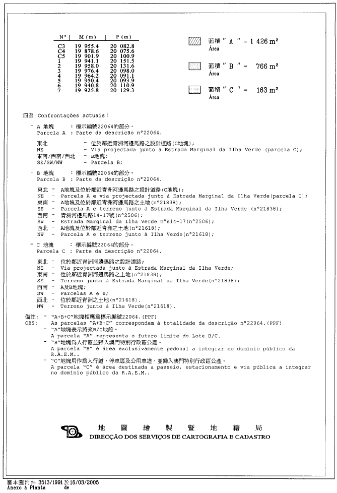 二、上述土地在地圖繪製暨地籍局於二零零五年三月十六日發出的第3513/1991號地籍圖中以字母“A”、“B”及“C”標示。