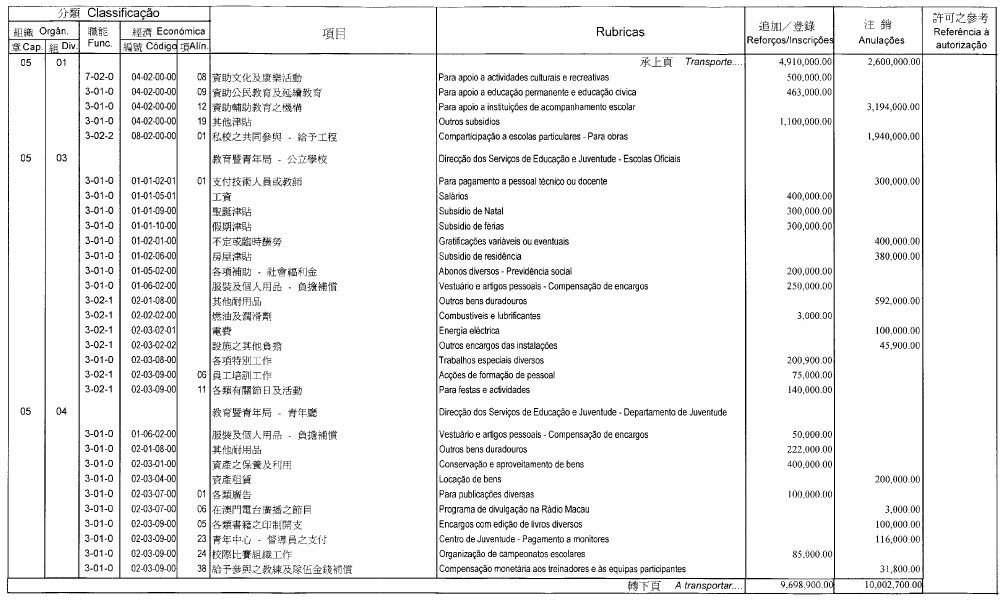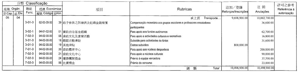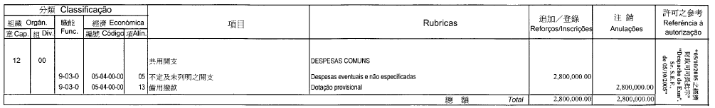 De acordo com o Despacho n.º 17/GM/87, de 30 de Abril, se publicam as seguintes transferências de verbas (OR/2005), autorizadas nos termos do n.º 3 do artigo 21.º do Decreto-Lei n.º 41/83/M, de 21 de Novembro, na redacção dada pelo artigo 1.º do Decreto-Lei n.º 22/87/M, de 27 de Abril: