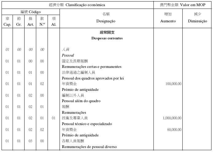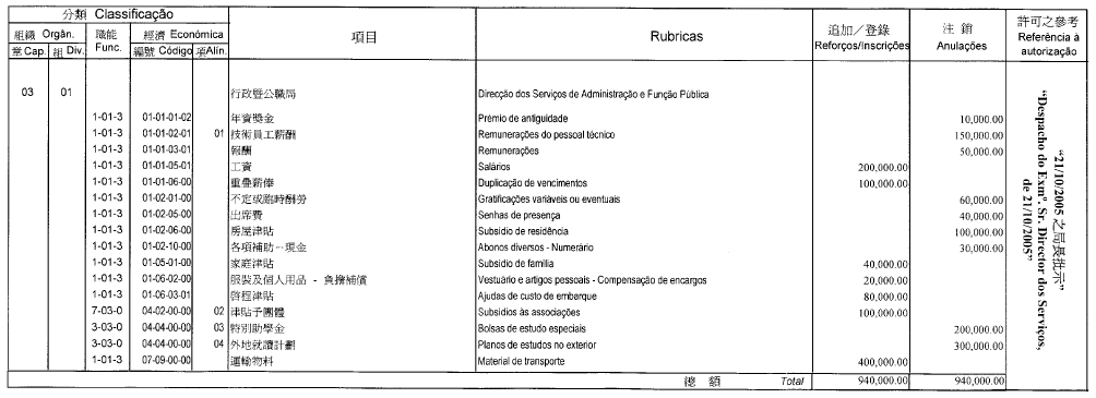 Coelho Dias Coutinho, Filipe——根據十二月二十一日第86/89/M號法令第十條第一款及根據十二月二十八日第62/98/M號法令修訂的十二月二十一日第87/89/M號法令核准的《澳門公共行政工作人員通則》第二十五條及第二十六條之規定,在本局擔任職務的編制外合同,自二零零五年十月十日起,以附註形式修改其合同第三條款,轉為第一職階顧問高級技術員的薪俸點600的薪俸。