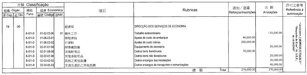 Varela dos Reis, José Alexandre——根據十二月二十一日第86/89/M號法令第十條第一款及根據十二月二十八日第62/98/M號法令修訂的十二月二十一日第87/89/M號法令核准的《澳門公共行政工作人員通則》第二十五條及第二十六條之規定,在本局擔任職務的編制外合同,自二零零五年十月十日起,以附註形式修改其合同第三條款,轉為第一職階特級技術員的薪俸點505的薪俸。
