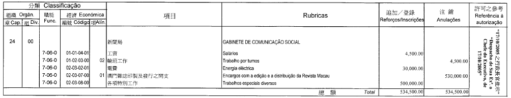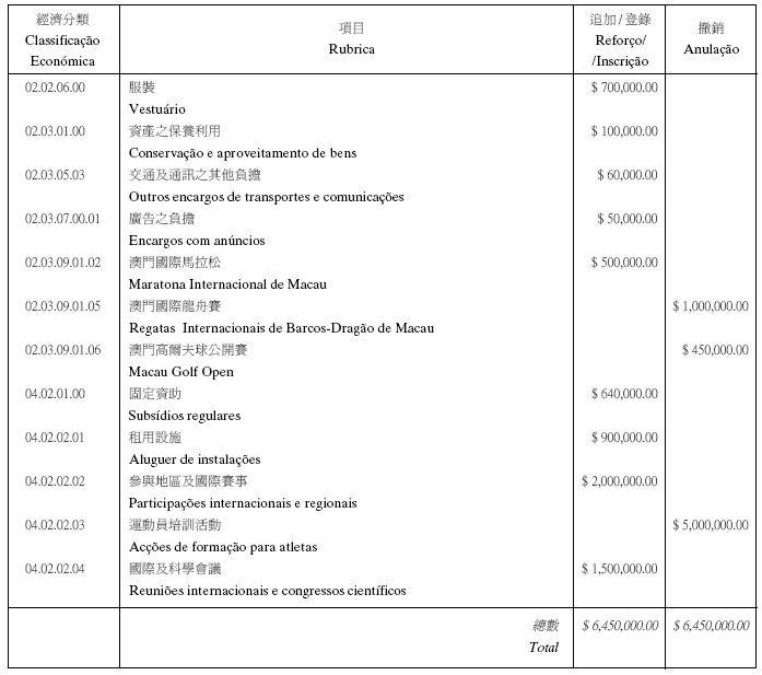 根據九月二十七日第53/93/M號法令第十九條規定,現刊登有關二零零五年度體育發展基金本身預算之修改,該等修改獲社會文化司司長在二零零五年十月二十四日之批示核准: