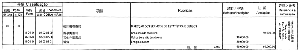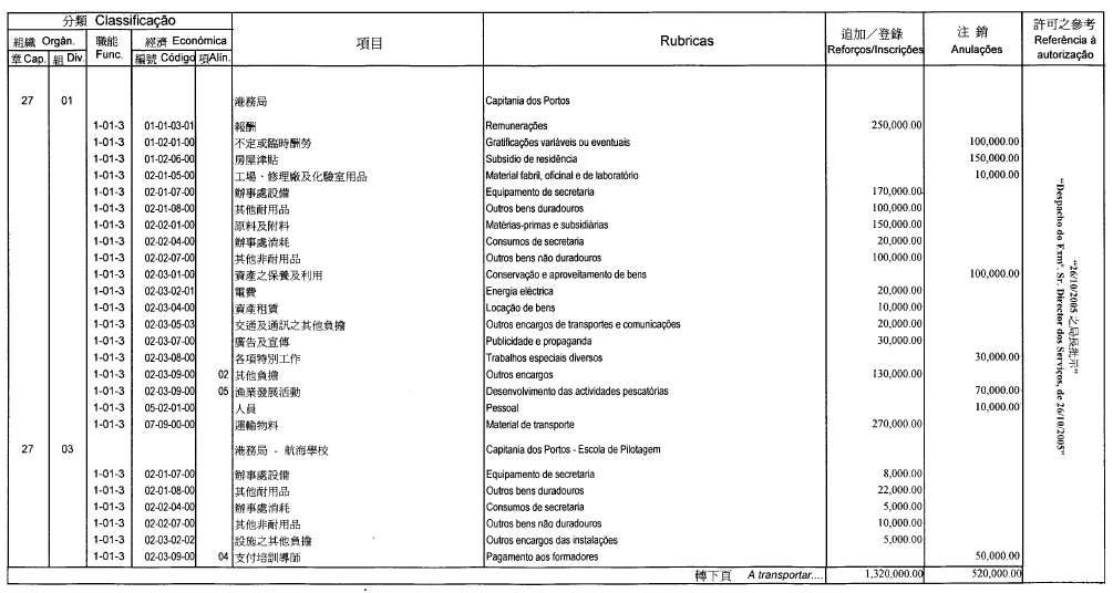 根據四月三十日第17/GM/87號批示,茲公布下列(澳門特別行政區財政預算/二零零五)款項轉帳,該轉帳由經四月二十七日第22/87/M號法令第一條修訂的十一月二十一日第41/83/M號法令第二十一條第三款規定所核准: