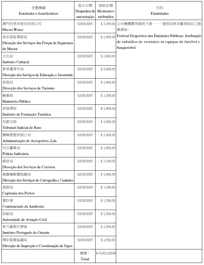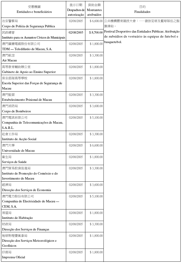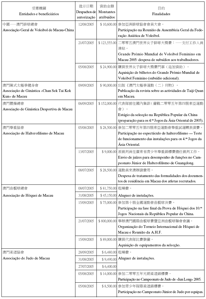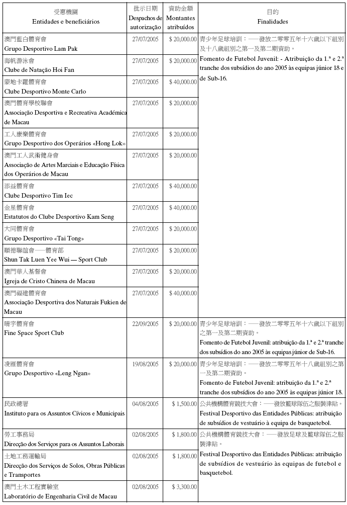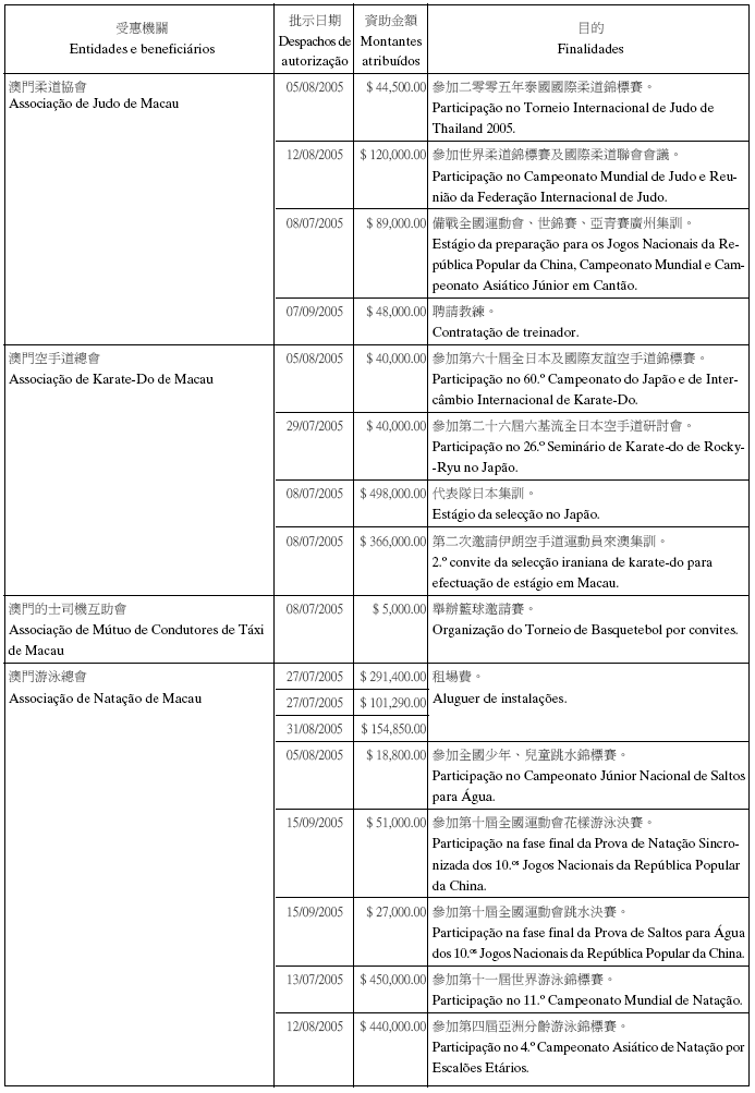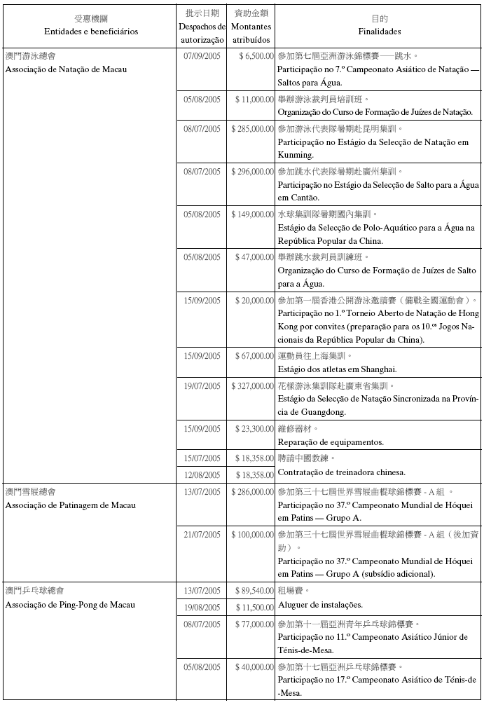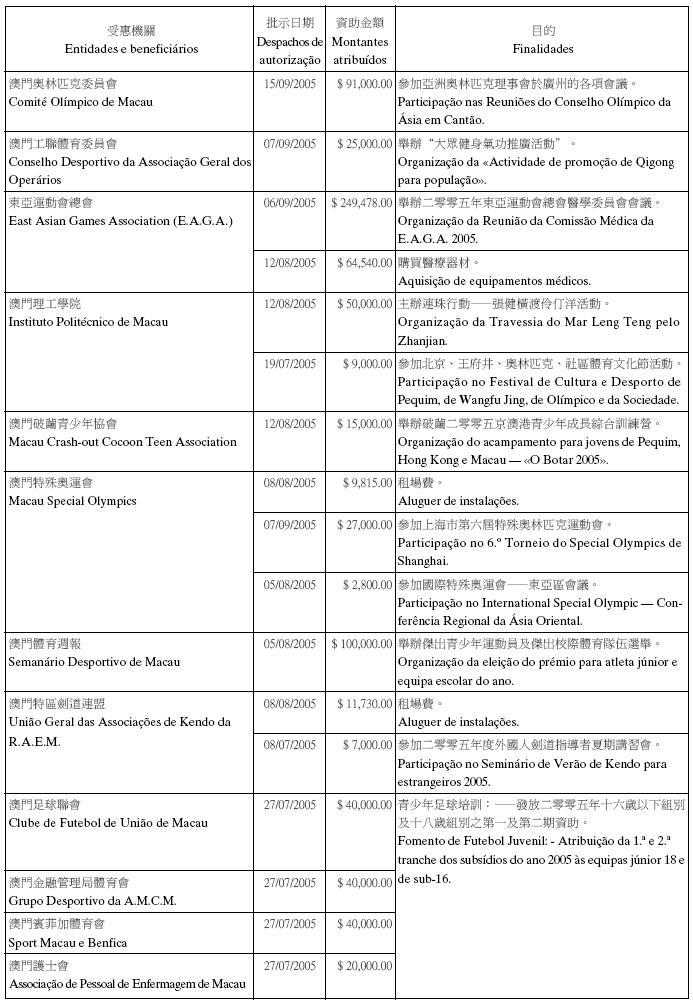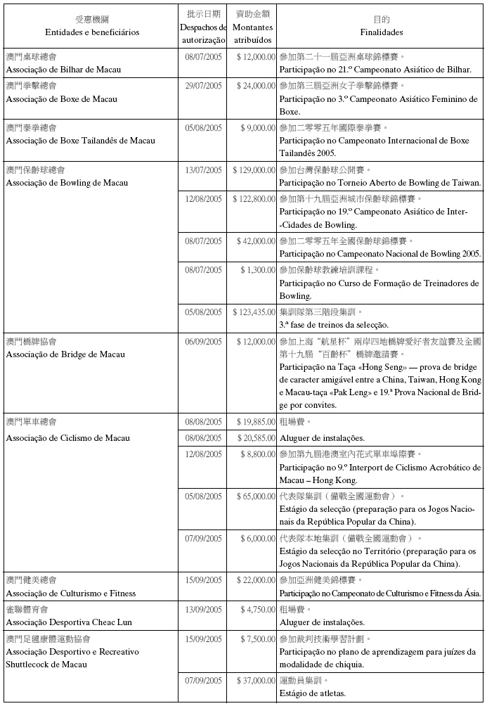 為履行關於給予私人及私立機構的財政資助的八月二十六日第54/GM/97號批示,體育發展基金現公佈二零零五年第三季度的資助表: