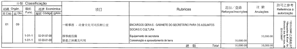 | 02-03-09-00-01 | Sessões, festas, espectáculos recreativos e culturais, excursões e desporto | $ 40,000.00 | |