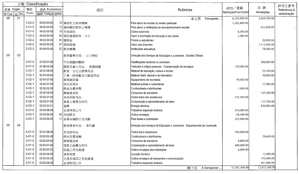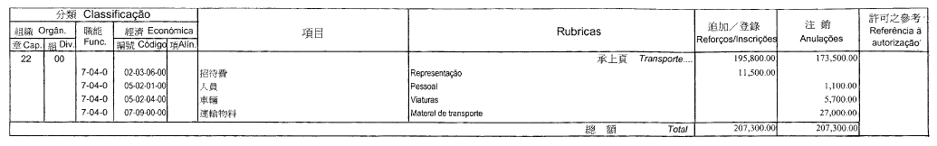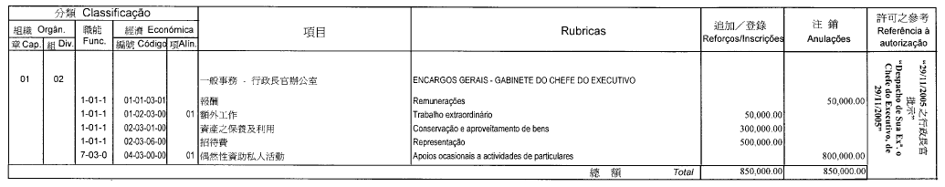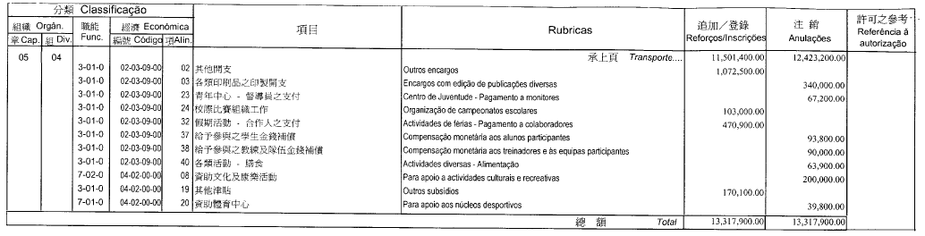 | 章 節 款 項 | 開支名稱 | 追加 (MOP) |