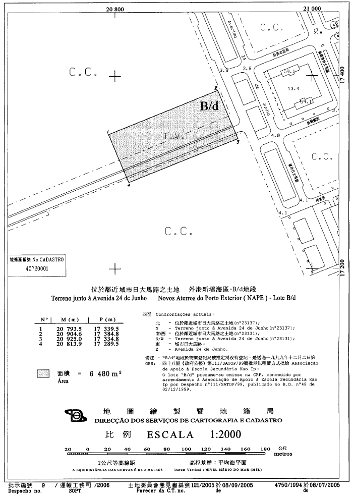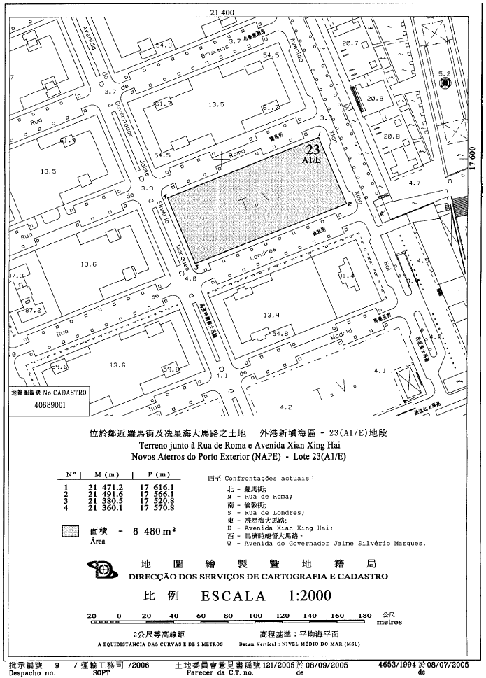 九、批出的土地標示在地圖繪製暨地籍局於二零零五年七月八日發出的第4653/1994號地籍圖上,並標示在物業登記局B104A冊第36頁第21940號。