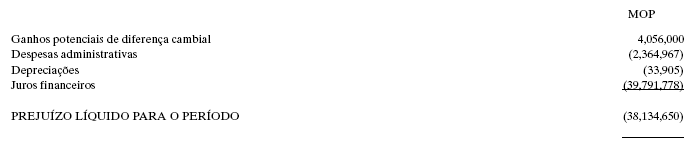 A Companhia está presentemente em fase de pré-abertura e por essa razão não registou quaisquer receitas durante o ano de 2005 para além dos juros dos depósitos bancários de que é titular. Durante o ano, a Companhia teve sucesso em aumentar o crédito financeiro dos bancos para o seu investimento em Macau, e manteve o esforço total na construção de um complexo hotel e casino de luxo localizado em Macau. No ano de 2005, a Companhia prosseguiu na sua política de recrutamento de quadros qualificados em antecipação ao início das suas operações em Macau. O Balanço e a Conta de ganhos e perdas relativos ao ano de 2005, que a seguir se apresentam, sintetizam a posição financeira da sociedade no ano de 2005.