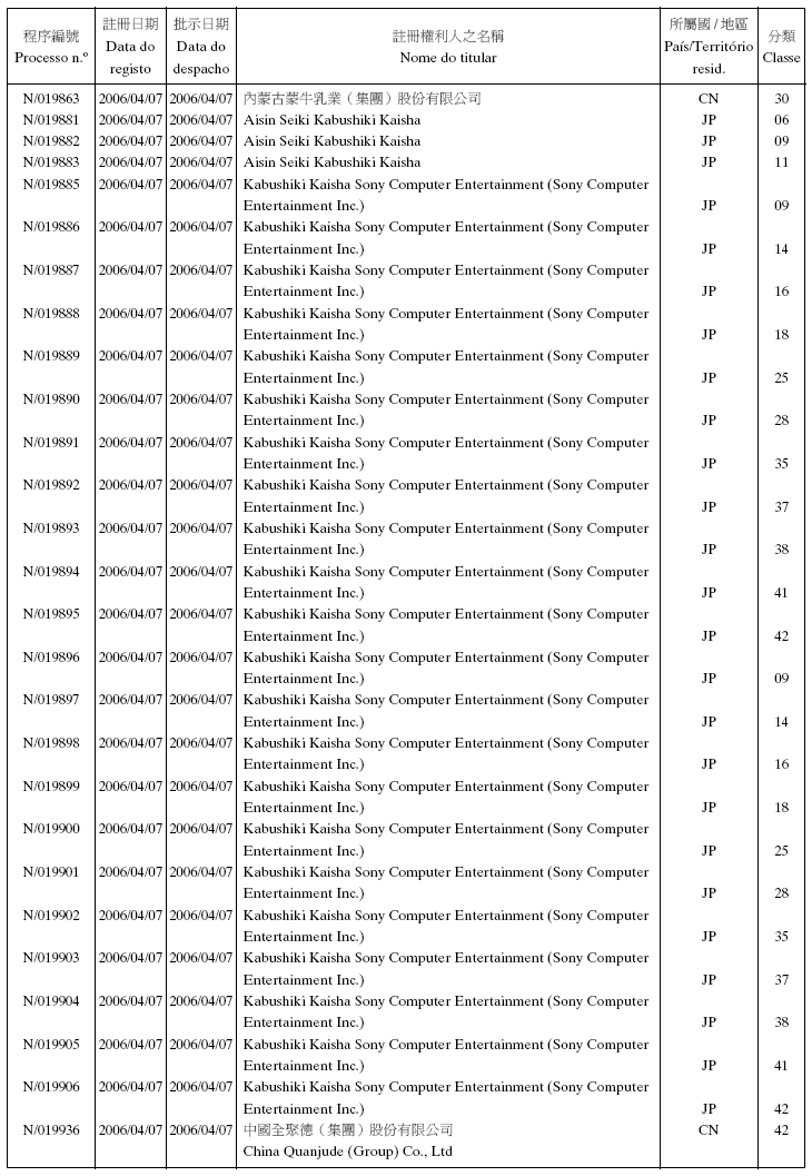 產品:自數據庫或互聯網在線提供的電子出版物及資訊;透過電子郵件提供的電子出版物;通訊硬件及軟件;互動電腦系統;屬此類的電子互動設備;電腦用硬件;電腦用遊戲程式;投幣及遊戲籌碼啟動的機器;遊戲籌碼;視像遊戲;電子遊戲檯;監督及數據處理系統;光碟;電動計時器;倒數計算計時器;上述屬此類之所有物品的部件、零件及配件。
