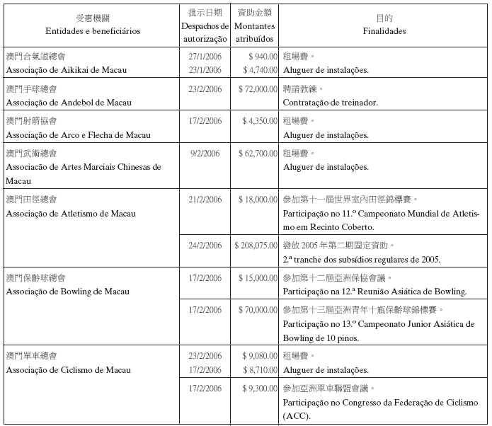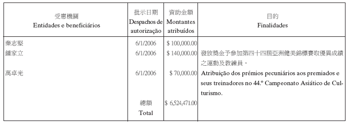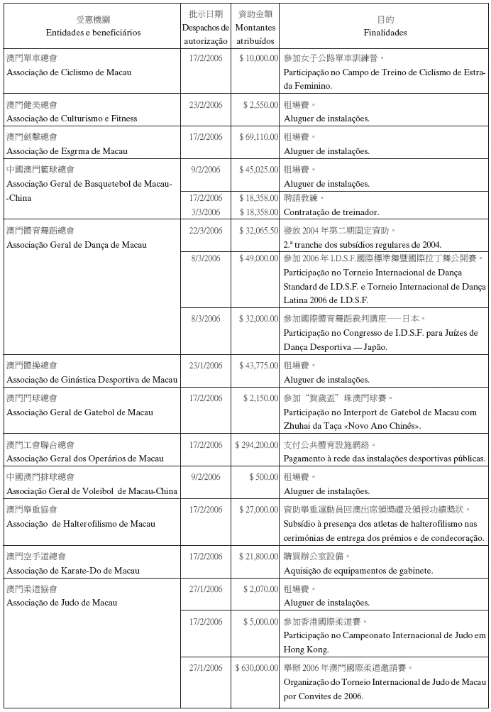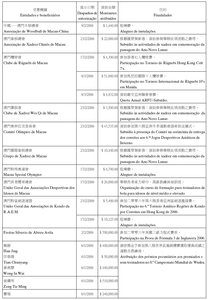 為履行關於給予私人及私立機構的財政資助的八月二十六日第54/GM/97號批示,體育發展基金現公佈二零零六年第一季度的資助表: