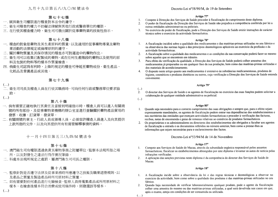 一、監察對九月十九日第58/90/M號法令及十一月十四日第 53/94/M號法令(分別規範藥物專業及藥物活動,以及從事中藥配製及貿易的場所發出准照制度及運作條件)的遵守的稽查權力由衛生局負責,基本上在上述兩個法規作出了規定, 分別是第七十七條至第八十條, 以及第十七條及第十八條。