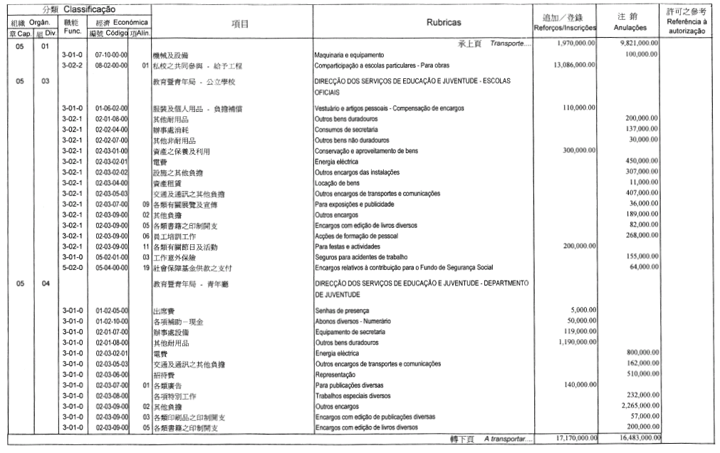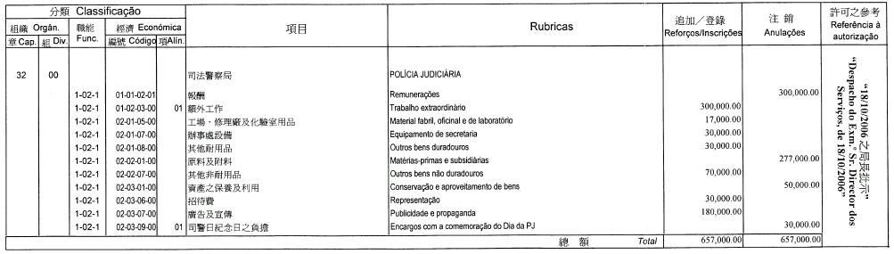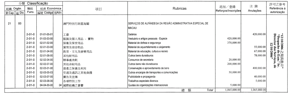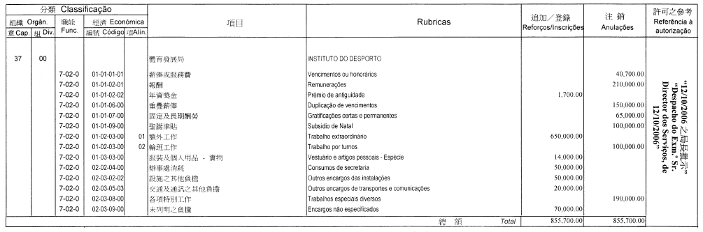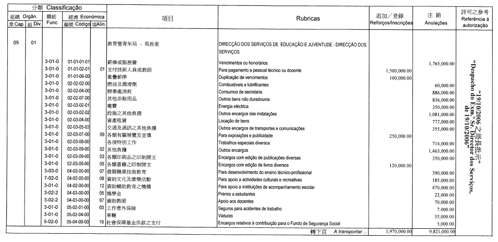 根據四月二十四日第6/2006號行政法規第四十一條之規定,公布二零零六年財政年度文化基金第五次預算及獨立預算之修改,有關修改是經社會文化司司長二零零六年十月十七日的批示許可: