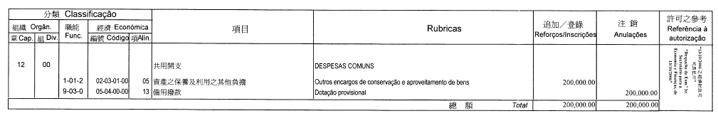 | 經濟分類 | 名稱 | 增加(澳門幣) | 註銷( 澳門幣) |