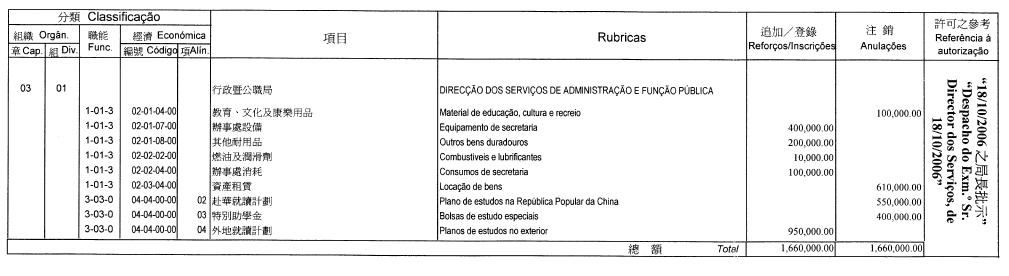根據九月二十七日第53/93/M號法令第十九條的規定,茲公佈經行政長官二零零六年十月十三日批示許可之二零零六年度澳門基金會本身預算之第三次修改: