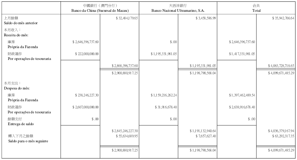 Obs: A receita própria da Fazenda engloba MOP 949 288,40 respeitantes às reposições abatidas nos pagamentos.