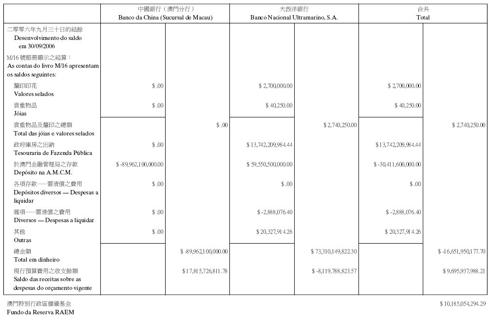 Resumo do movimento do Cofre Geral da RAEM, no mês de Setembro de 2006