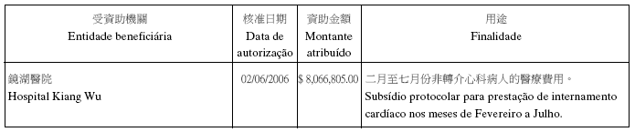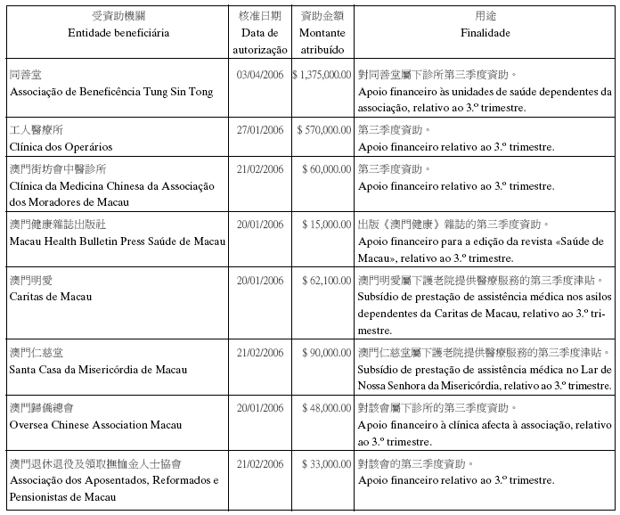 Em cumprimento do Despacho n.º 54/GM/97, de 26 de Agosto, referente aos apoios financeiros concedidos a particulares e a instituições particulares, vêm os Serviços de Saúde publicar a listagem dos apoios concedidos no 3.º trimestre de 2006: