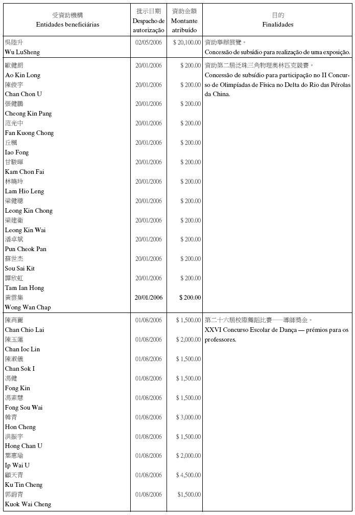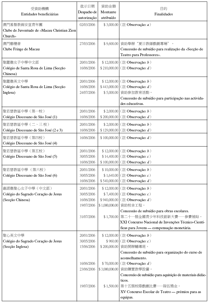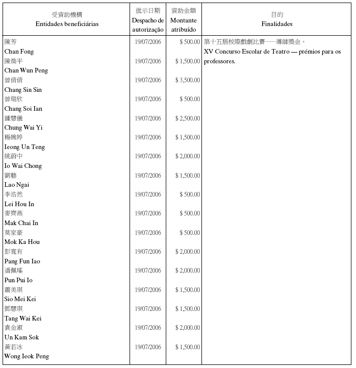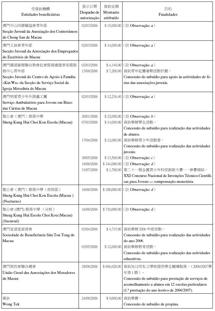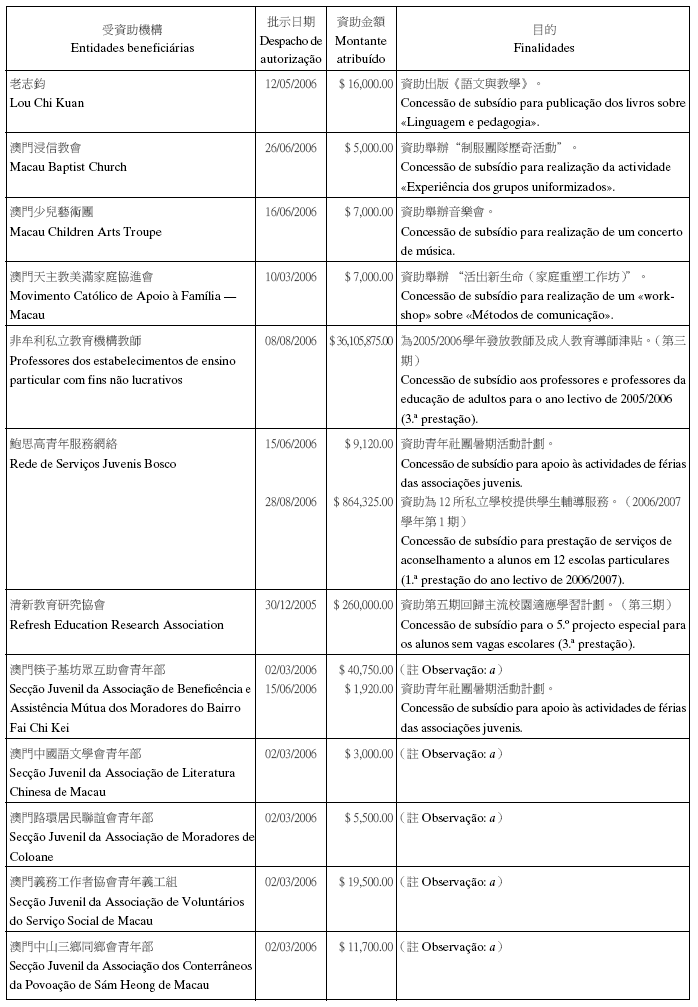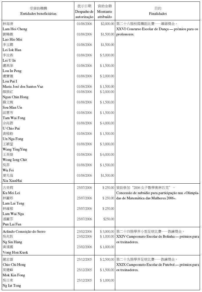 Em cumprimento do Despacho n.º 54/GM/97, de 26 de Agosto, referente aos apoios financeiros concedidos a particulares e instituições particulares, vem a Direcção dos Serviços de Educação e Juventude publicar a listagem dos apoios concedidos no 3.º trimestre de 2006: