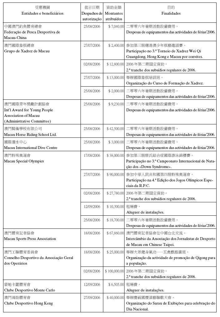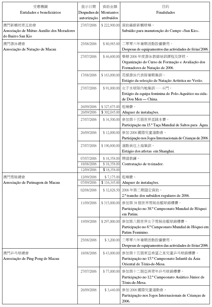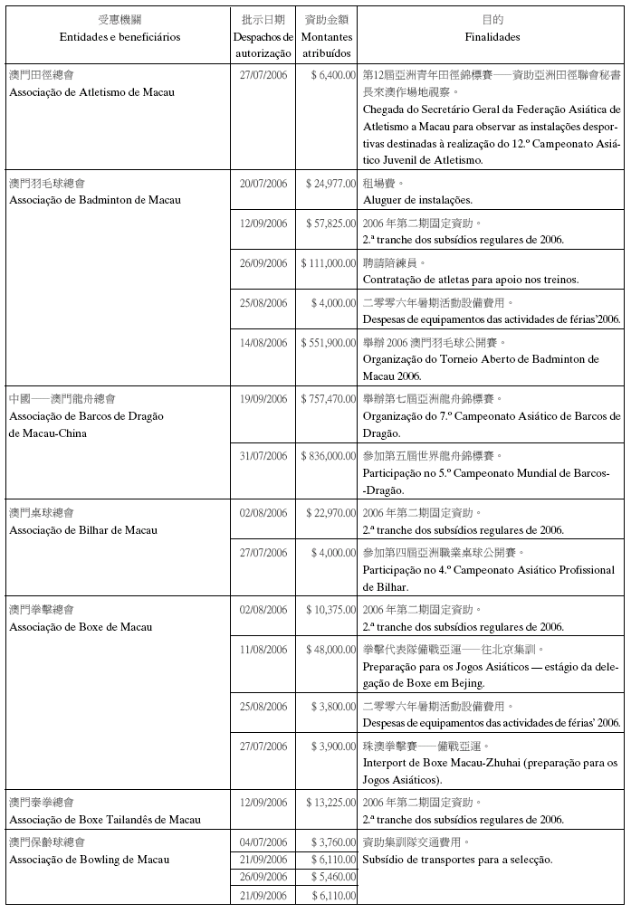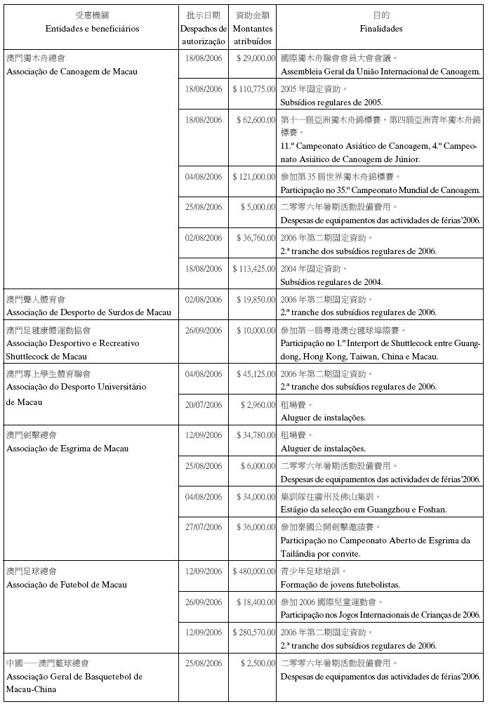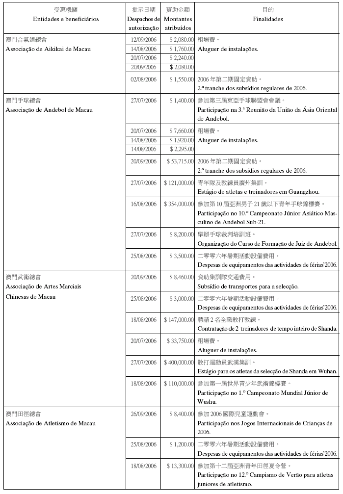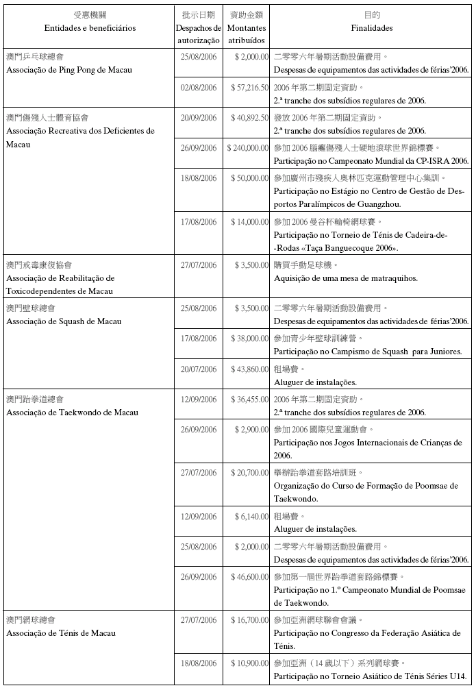 為履行關於給予私人及私立機構的財政資助的八月二十六日第54/GM/97號批示,體育發展基金現公佈二零零六年第三季度的資助表: