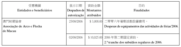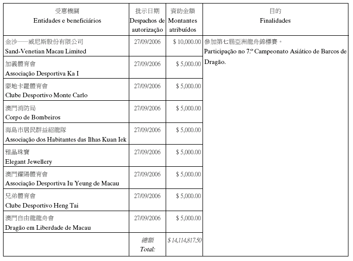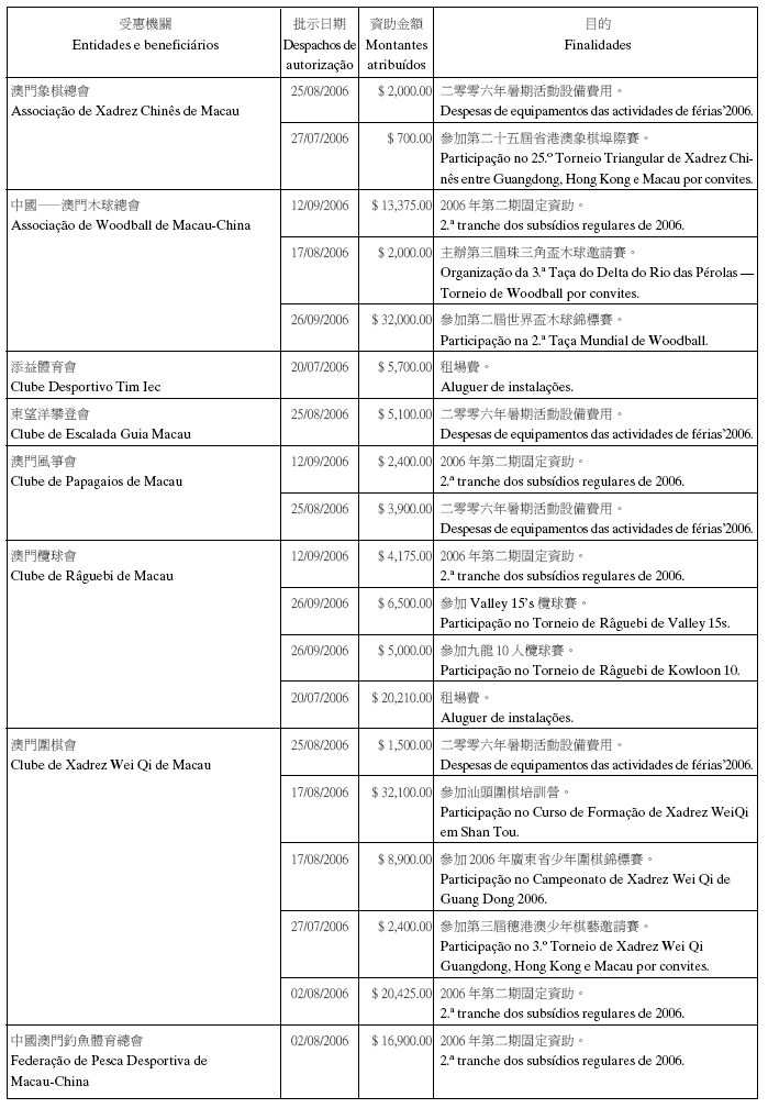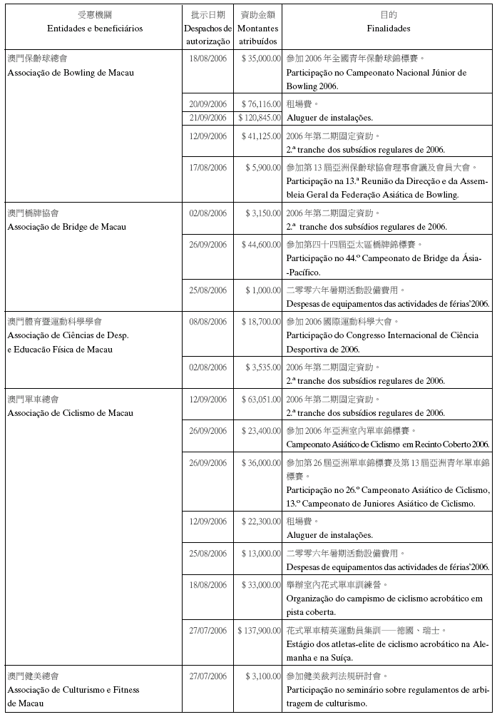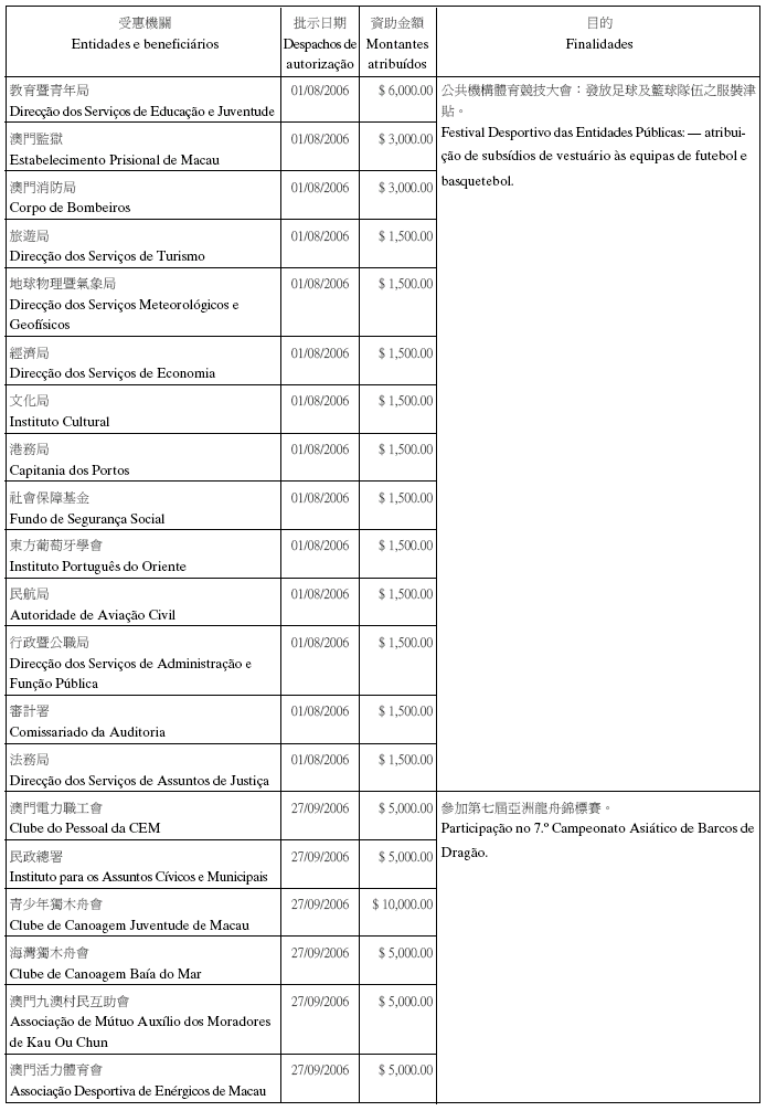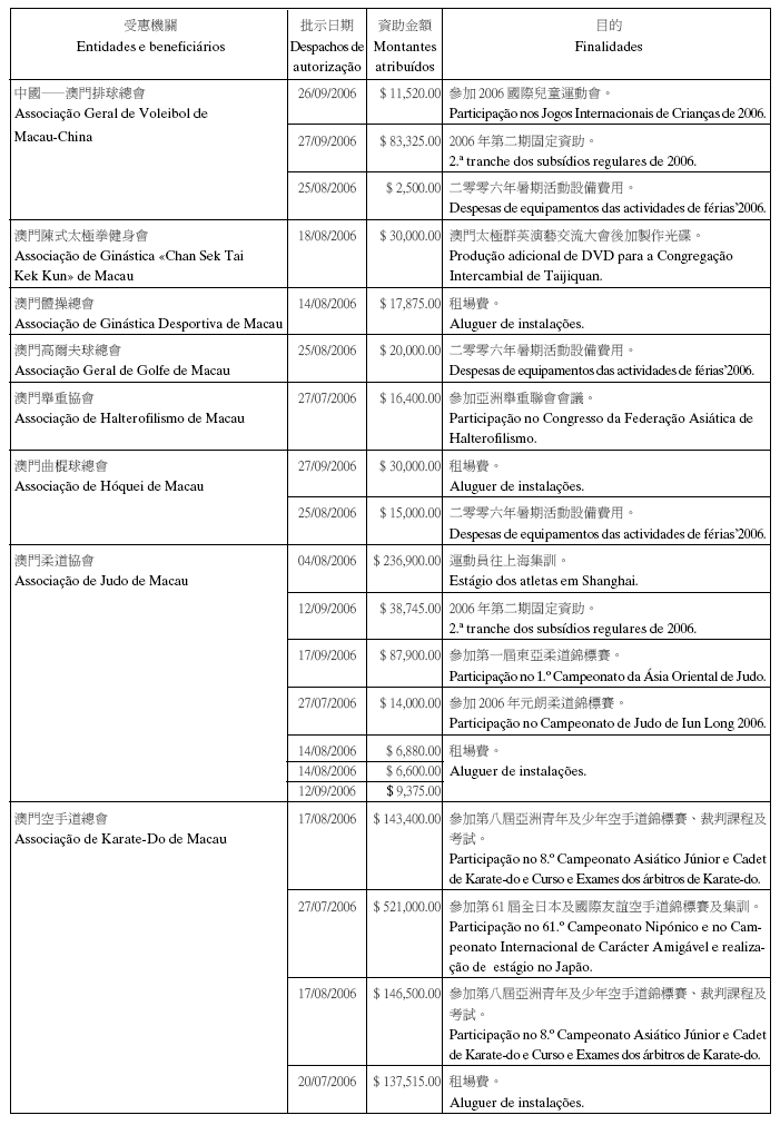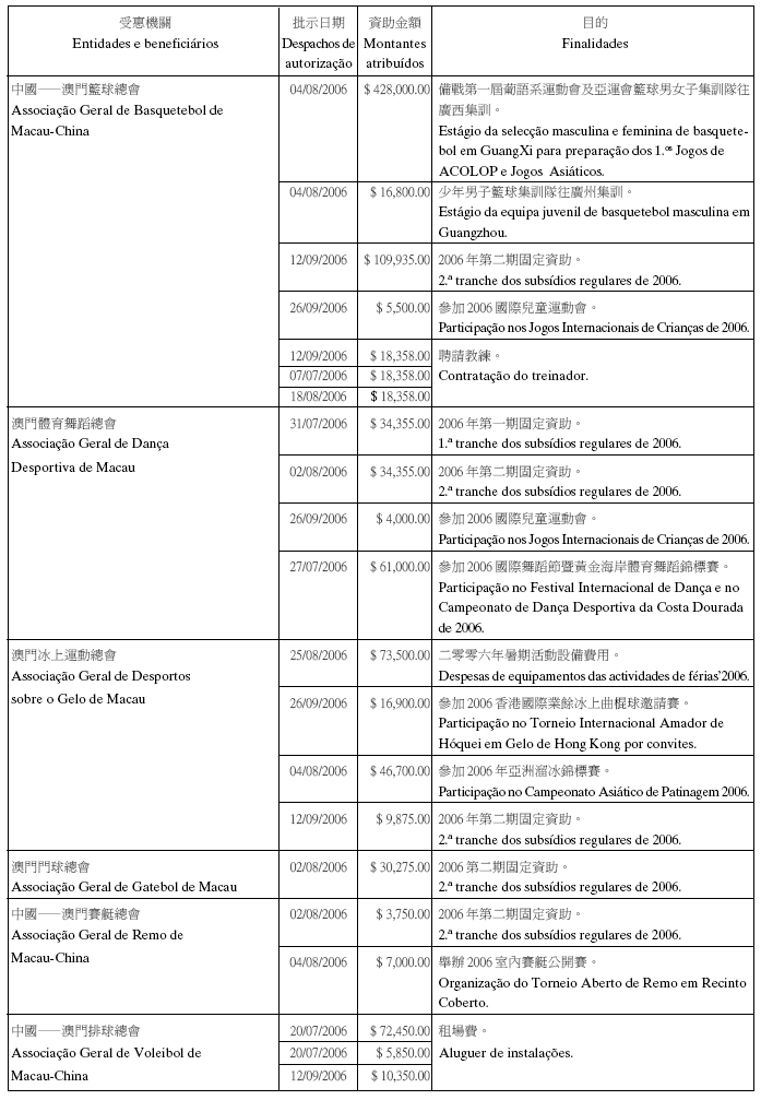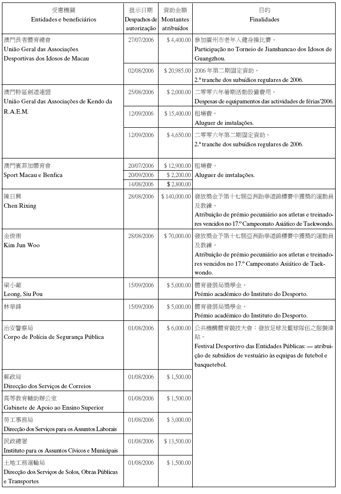 為履行關於給予私人及私立機構的財政資助的八月二十六日第54/GM/97號批示,體育發展基金現公佈二零零六年第三季度的資助表: