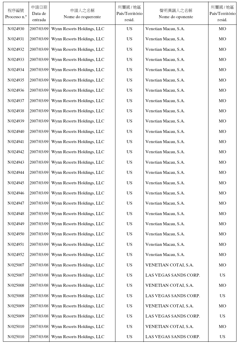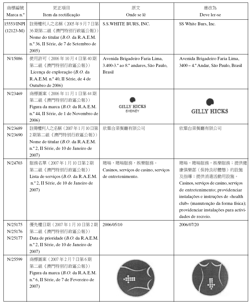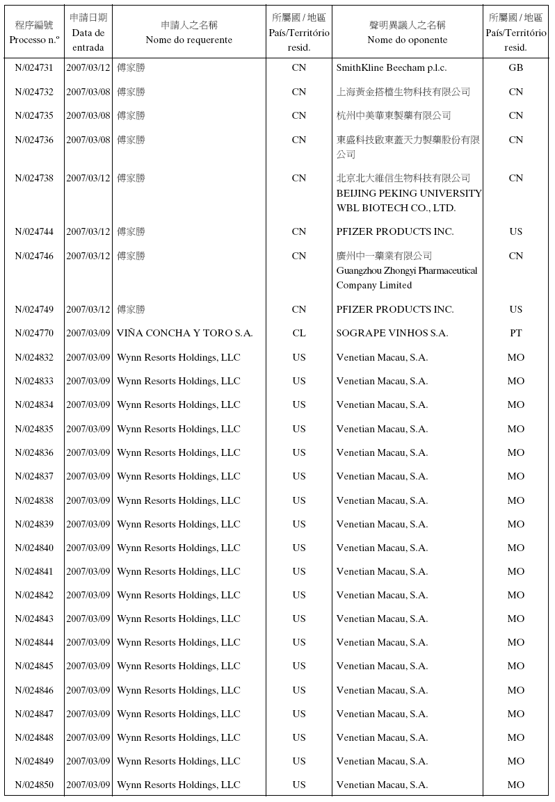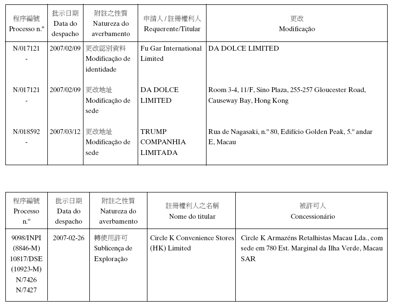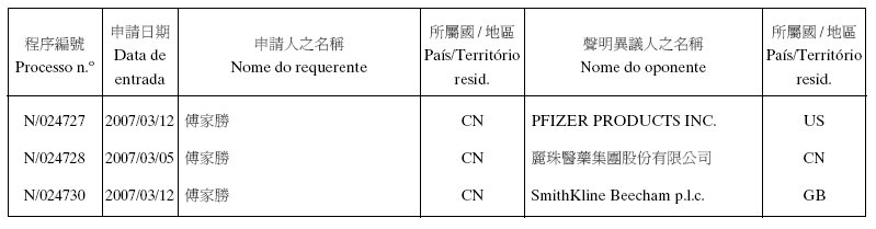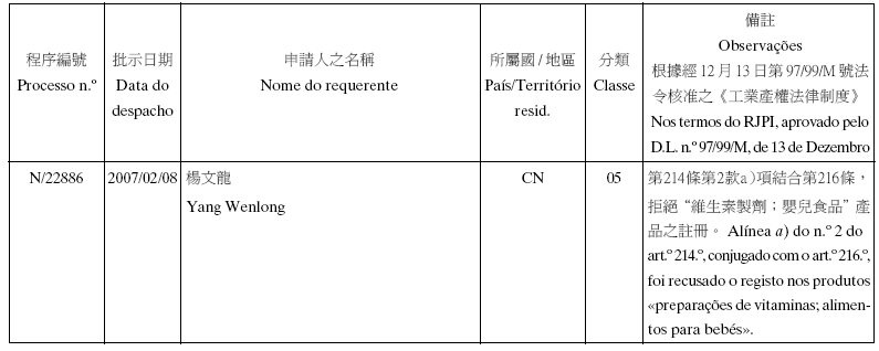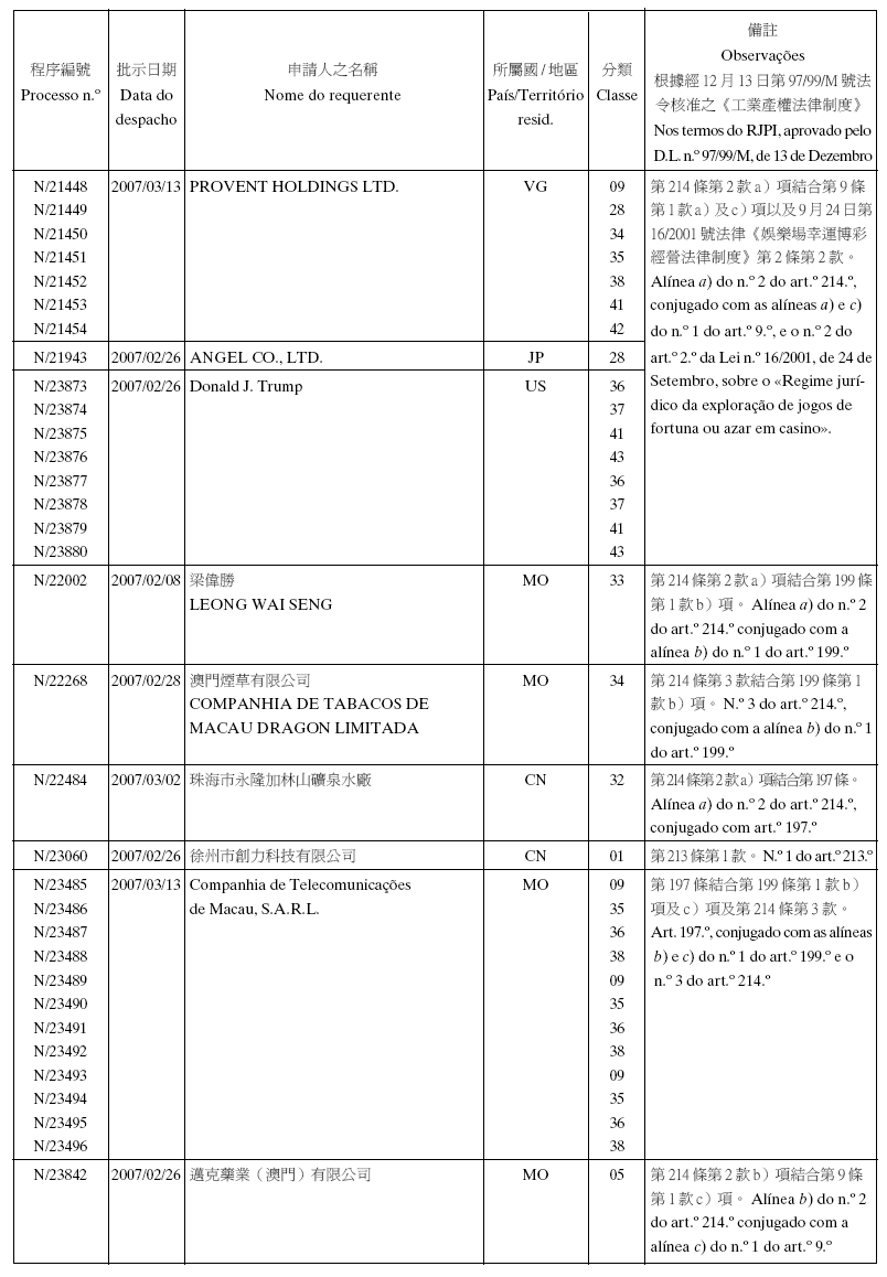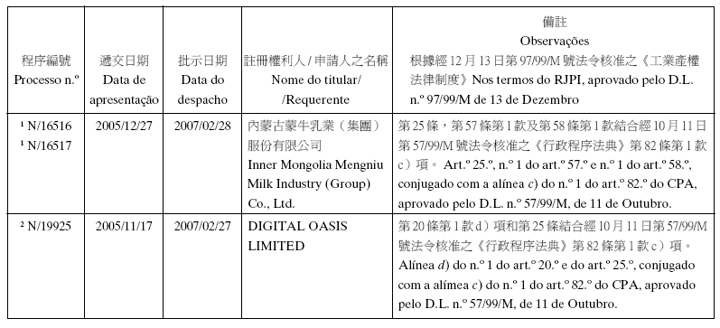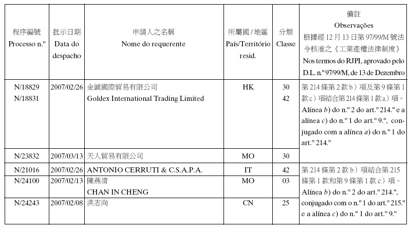 Em conformidade com a alínea d) dos n.os 1 e 2 do artigo 10.º do RJPI, aprovado pelo Decreto-Lei n.º 97/99/M, de 13 de De-zembro, e de acordo com os artigos 275.º a 277.º do referido diplo-ma, cabe recurso para o Tribunal Judicial de Base, dos despachos abaixo mencionados, no prazo de um mês a contar da data desta publicação.