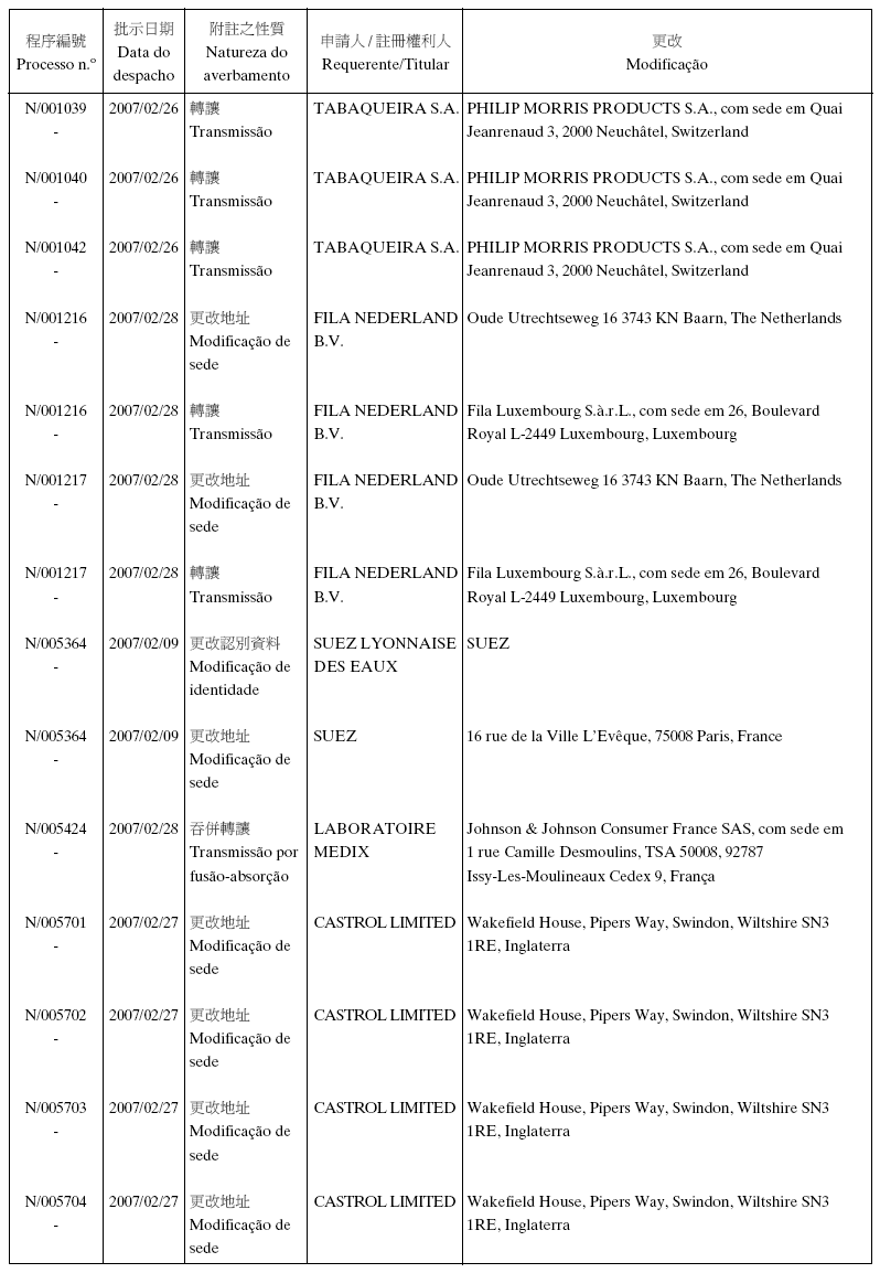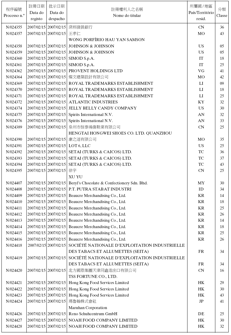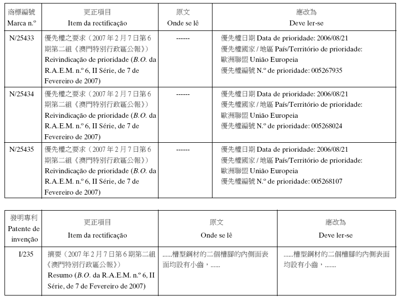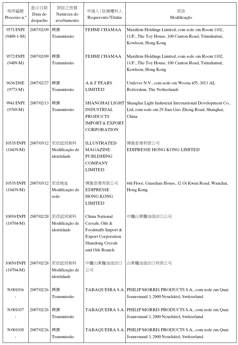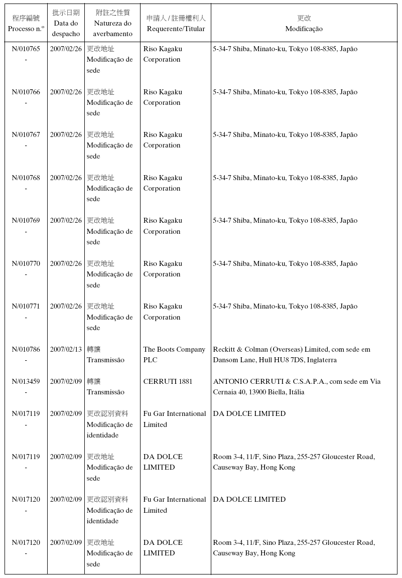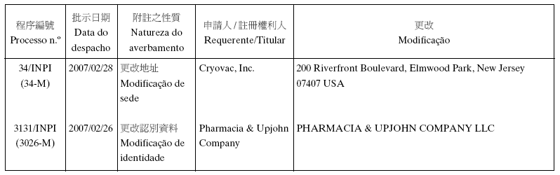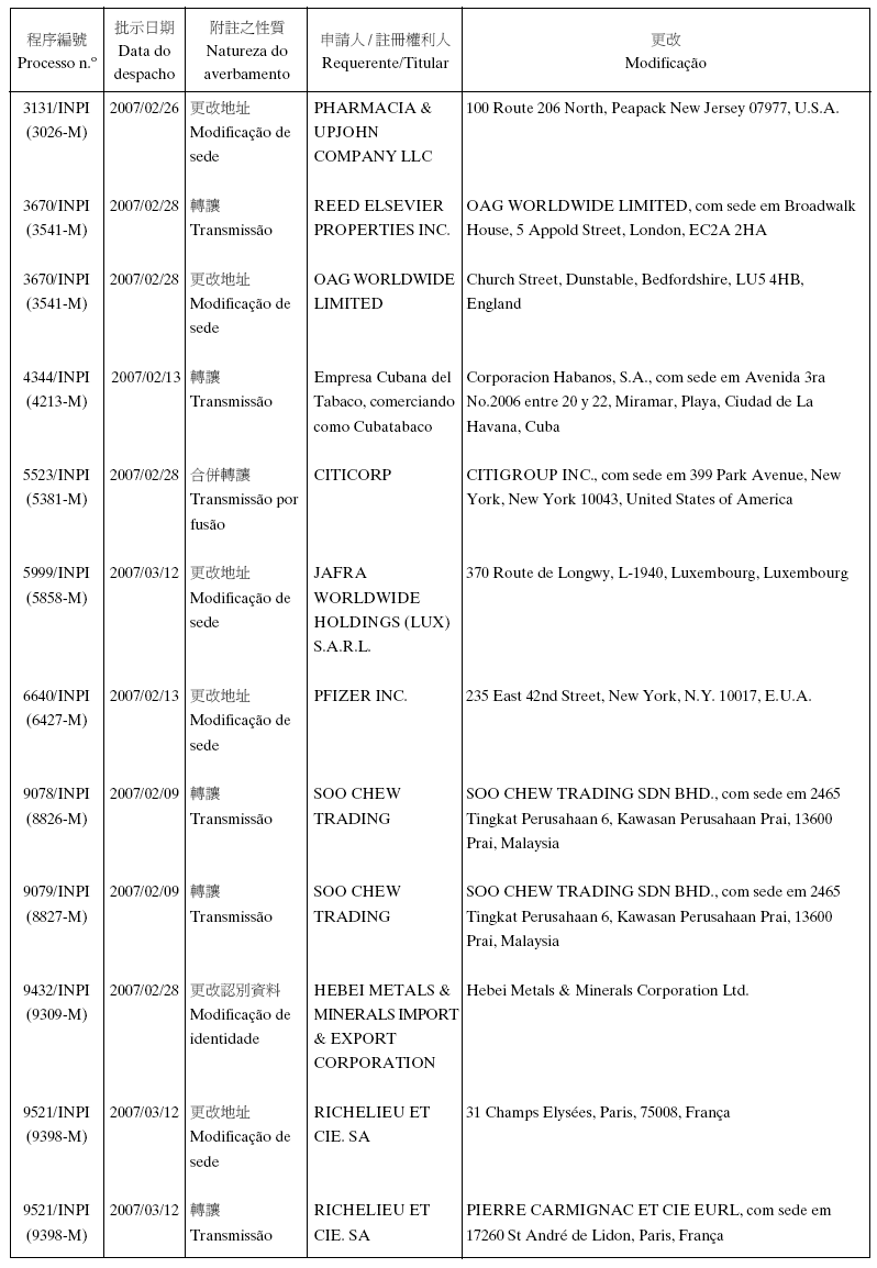 Em conformidade com a alínea d) dos n.os 1 e 2 do artigo 10.º do RJPI, aprovado pelo Decreto-Lei n.º 97/99/M, de 13 de De-zembro, e de acordo com os artigos 275.º a 277.º do referido diplo-ma, cabe recurso para o Tribunal Judicial de Base, dos despachos abaixo mencionados, no prazo de um mês a contar da data desta publicação.