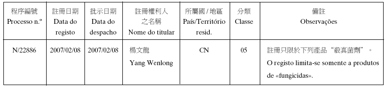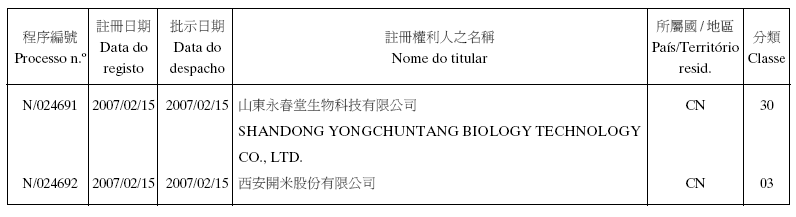 - 2. Por sentença do Tribunal Judicial de Base, de 02/01/2007, que transitou em julgado no dia 18/01/2007, foi julgado procedente o recurso, revogando o despacho recorrido e ordenando o registo da marca em causa, sendo que em relação aos «serviços de armazém de vendas para venda a retalho de preparados para o tratamento da pele» não foi concedido o direito no uso exclusivo das expressões «Skin Simple» e «護膚易»