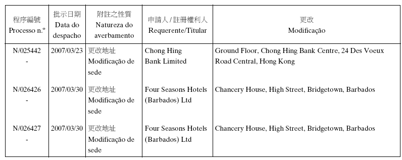 申請人:MELCO PBL ENTERTAINMENT (Macau) LIMITED, Walker House, 87 Mary Street, George Town, Grand Cayman, KY1 - 9002, Ilhas Cayman.