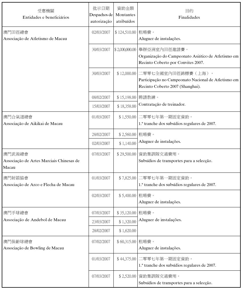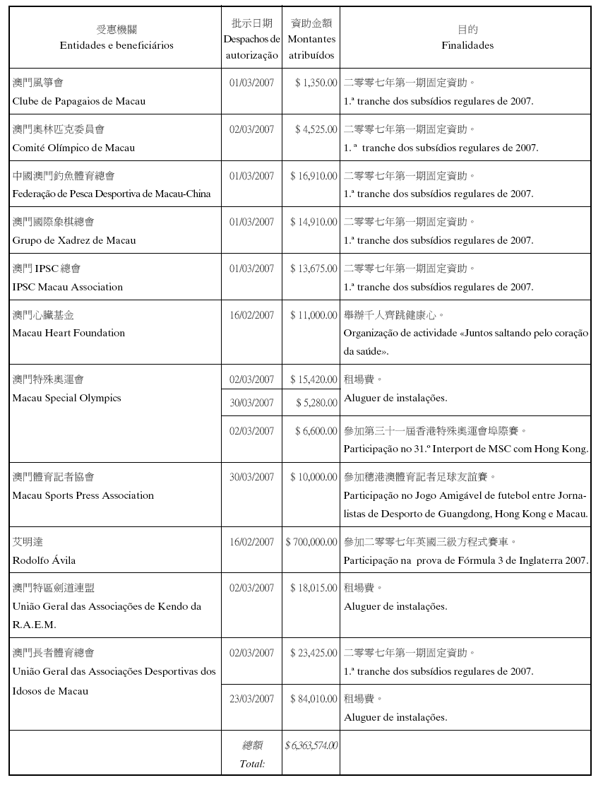 為履行關於給予私人及私立機構財政資助的八月二十六日第54/GM/97號批示,體育發展基金現公佈二零零七年第一季度的資助表: