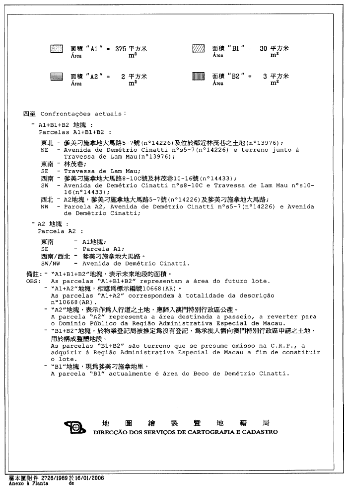 2. 上款所述該等在上述地籍圖中以字母“A”及“A1”標示的地塊,將會合併及以長期租借制度共同利用,組成一幅面積118(壹佰壹拾捌)平方米的單一地段,以下簡稱土地,其批給轉由本合同的條款規範。