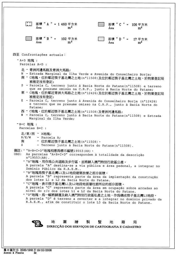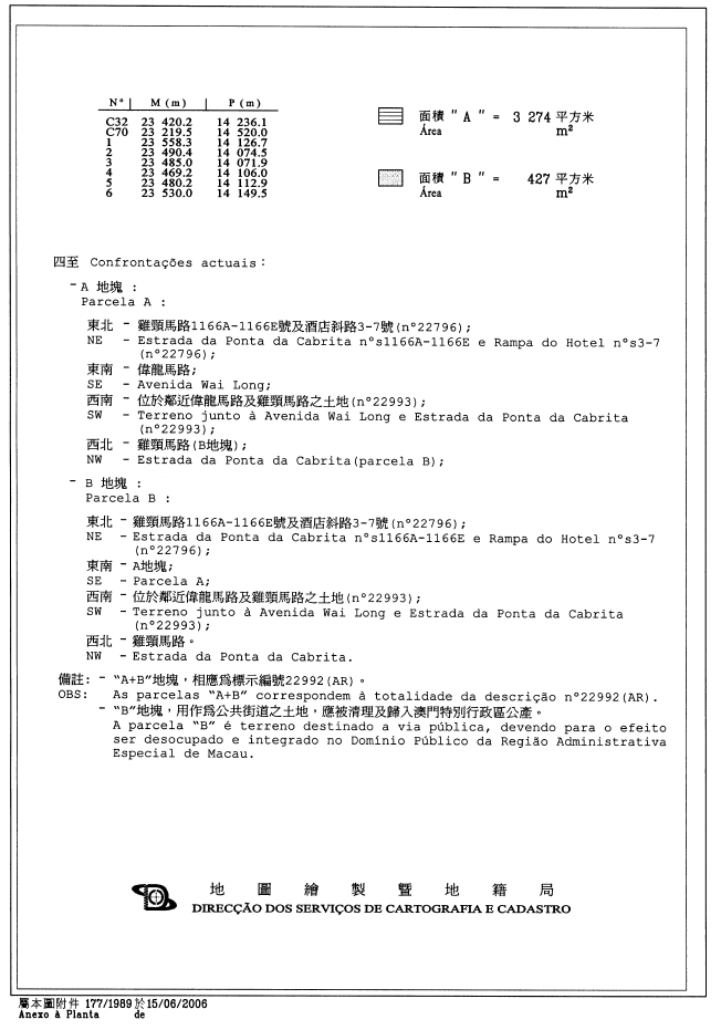 三、1b地段的面積分別為3,274平方米及427平方米,在地圖繪製暨地籍局於二零零六年六月十五日發出的第177/1989號地籍圖中以字母“A”及“B”標示,標示於物業登記局第22992號及以承批人名義登錄於第8131G號。