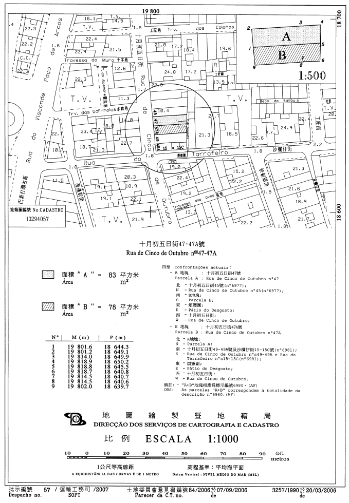 一、根據本批示組成部分的附件合同所載規定及條件,批准將一幅面積161平方米,位於澳門半島十月初五街,其上建有47號及47A號樓宇的租借土地分割,以組成兩幅面積分別為83平方米及78平方米的獨立租借土地。