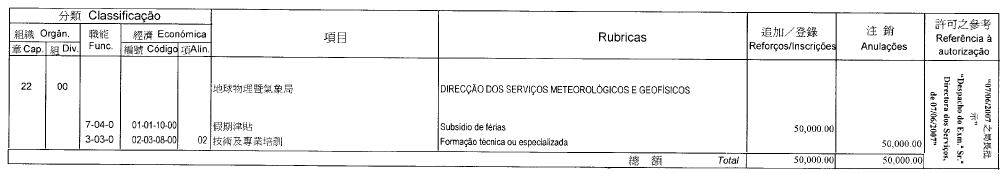 根據十二月二十一日第86/89/M號法令的第十一條第一款及第二款的規定,以附註形式修改陳政豪及鄧耀民在本局擔任職務的編制外合同第三條款,自二零零七年六月三十日起轉為收取相等於第二職階二等氣象技術員的薪俸點340的薪俸。