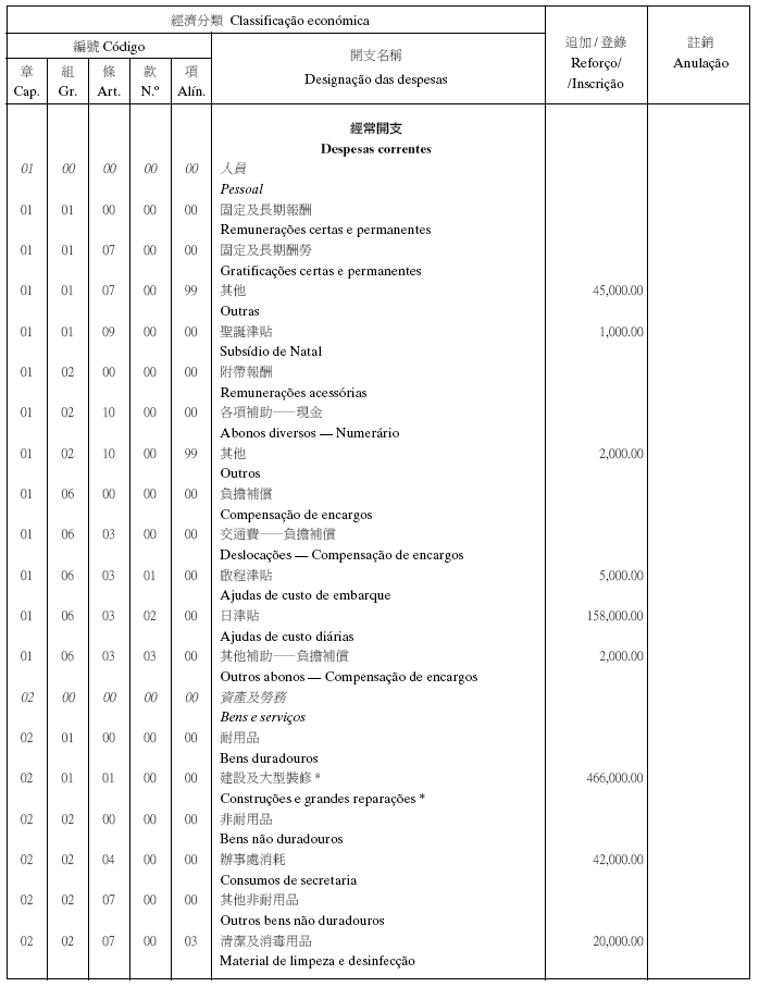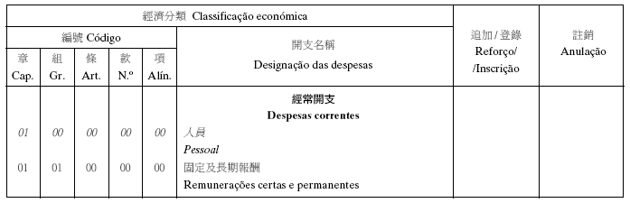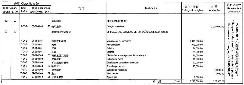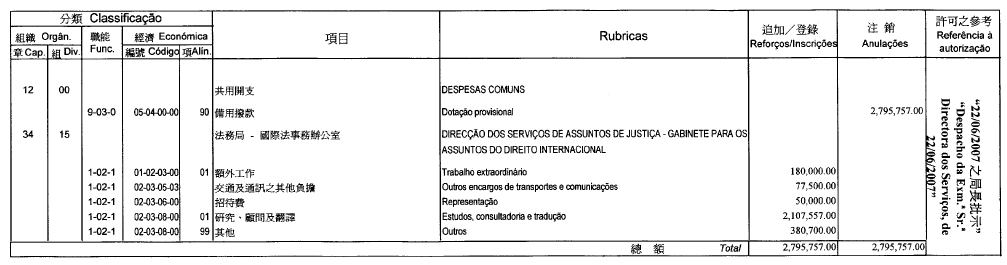 Wong, Chio Kan, como operário, 5.º escalão, índice 150, a partir de 23 de Julho de 2007.