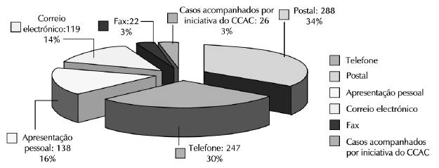Das formas de apresentação de queixas, a via telefónica e postal são as mais utilizadas, representando 63,7% do número total. Houve também 138 queixas que foram apresentadas pessoalmente pelos cidadãos, registando-se uma diminuição relativamente ao ano anterior. Paralelamente, as queixas através de correio electrónico têm revelado uma tendência crescente nos últimos anos. O CCAC reforçará a divulgação, para que os cidadãos saibam que as informações fornecidas são mantidas confidenciais, encorajando-os a apresentar queixas identificadas, tendo em vista melhorar a eficiência do tratamento dos casos.