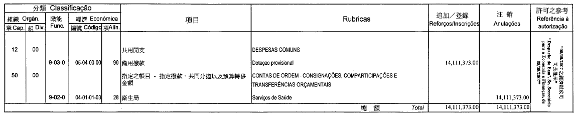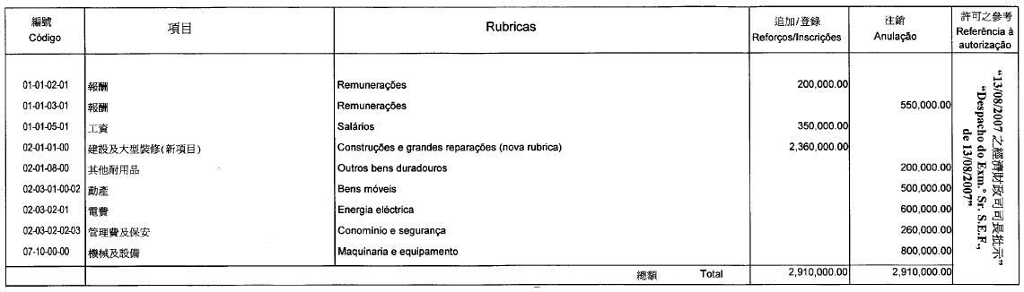 De acordo com o artigo 41.º do Regulamento Administrativo n.º 6/2006, publica-se a 3.ª alteração orçamental ao orçamento individualizado do Centro de Estudos Estratégicos para o Desenvolvimento Sustentável do orçamento privativo da Fundação Macau de 2007, autorizada por despacho de S. Ex.ª o Chefe do Executivo, de 10 de Agosto do mesmo ano: