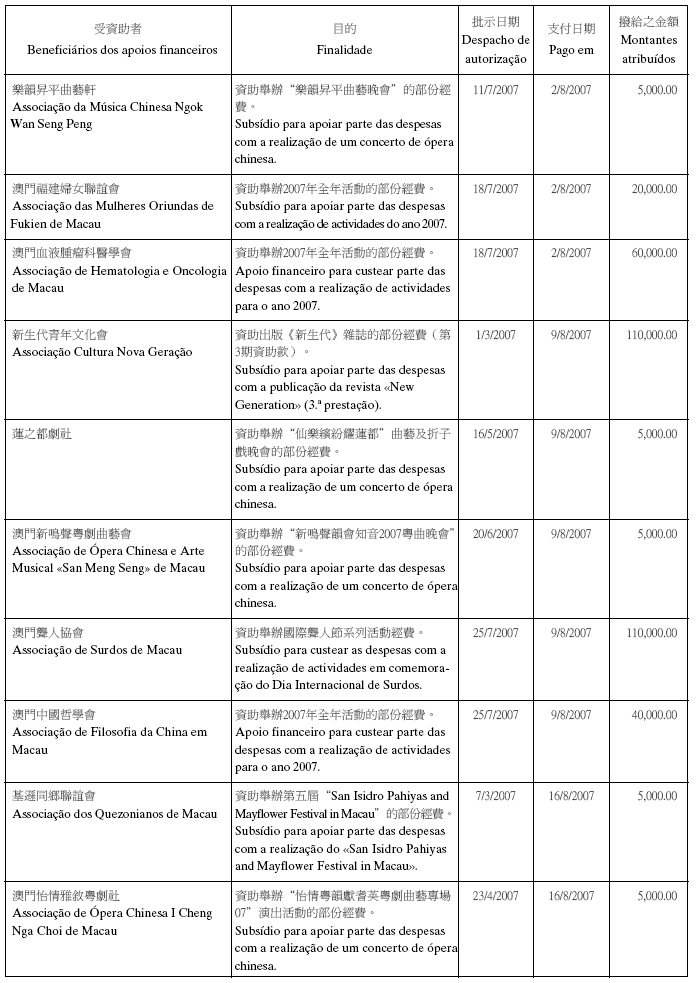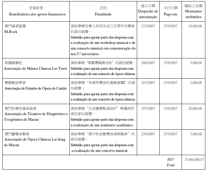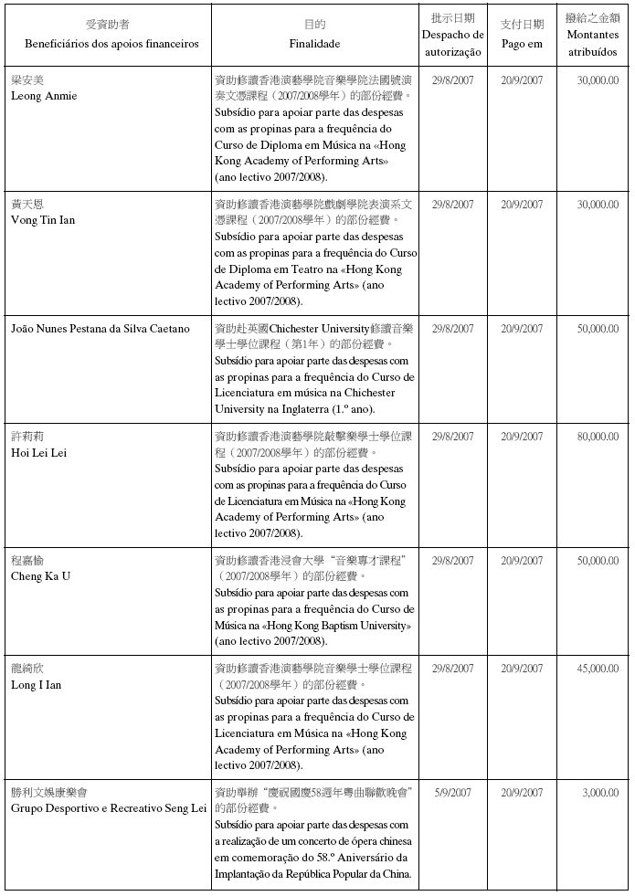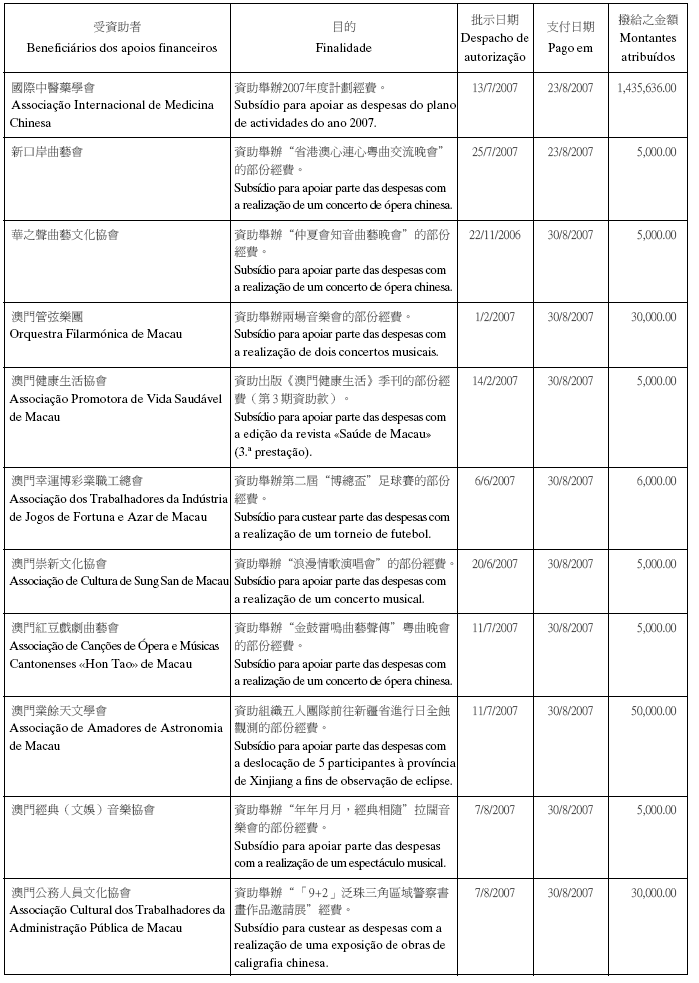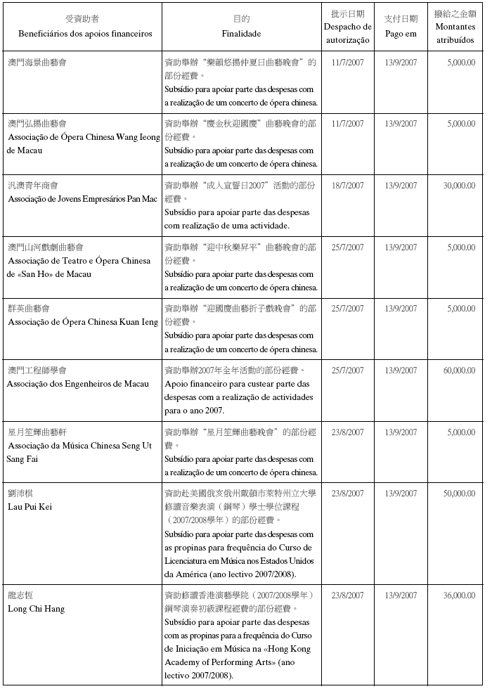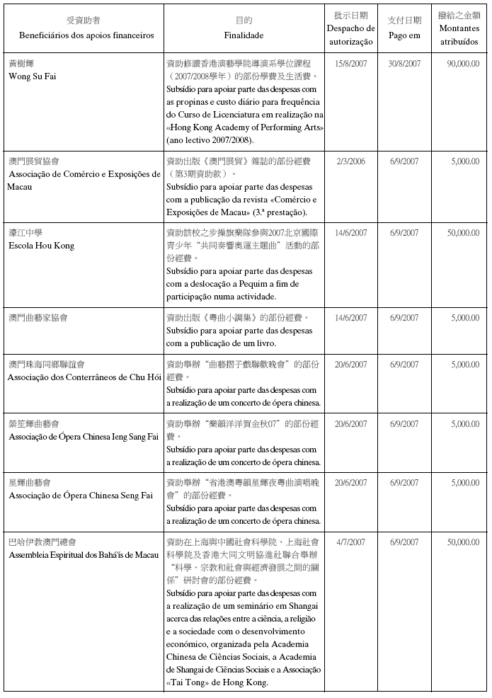 根據八月二十六日第54/GM/97號批示關於撥給私人和私人機構財政資助的有關規定,澳門基金會現公佈二零零七年第三季度的資助名單: