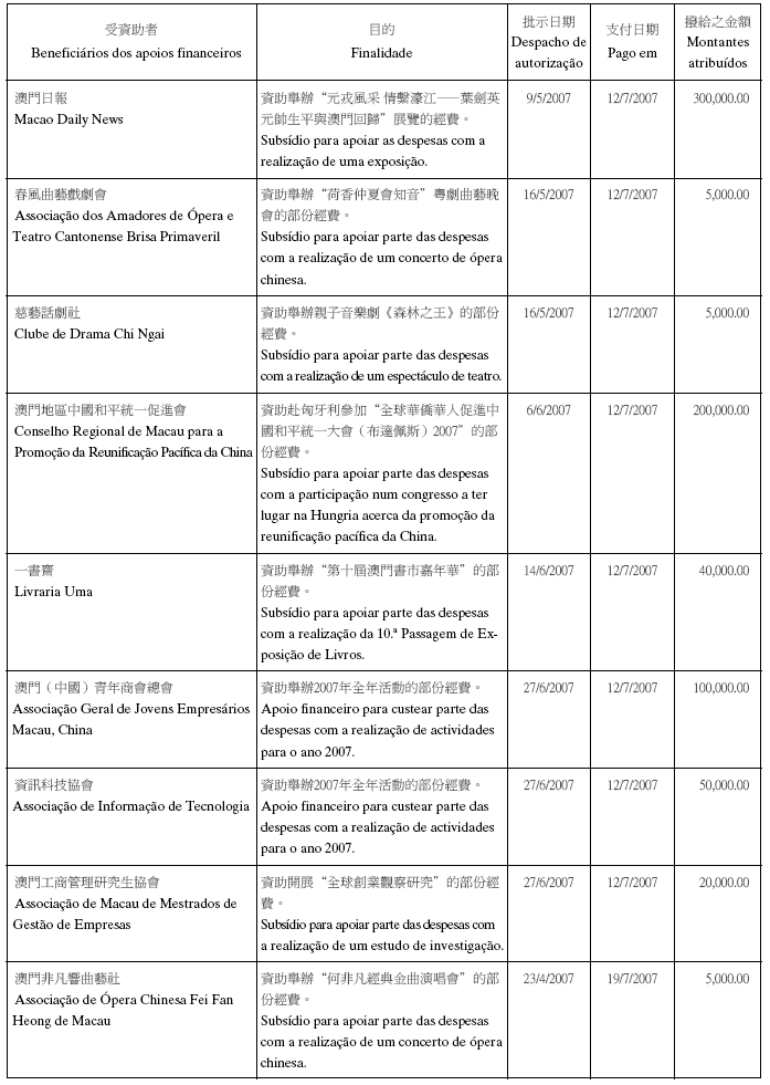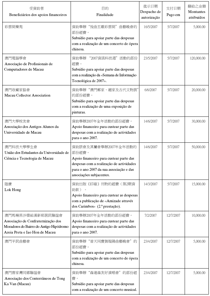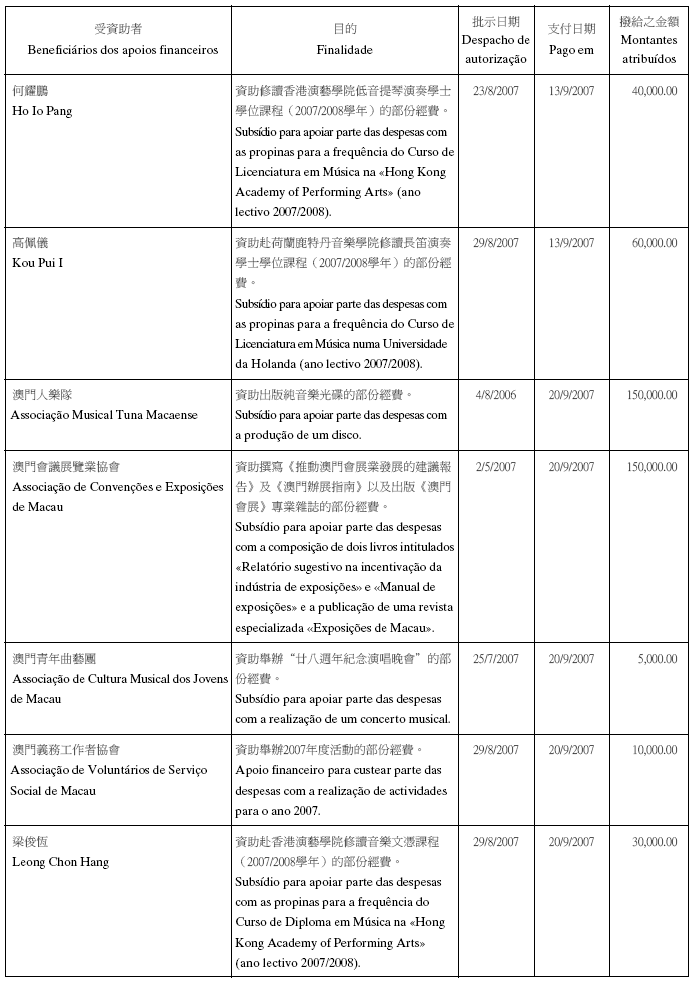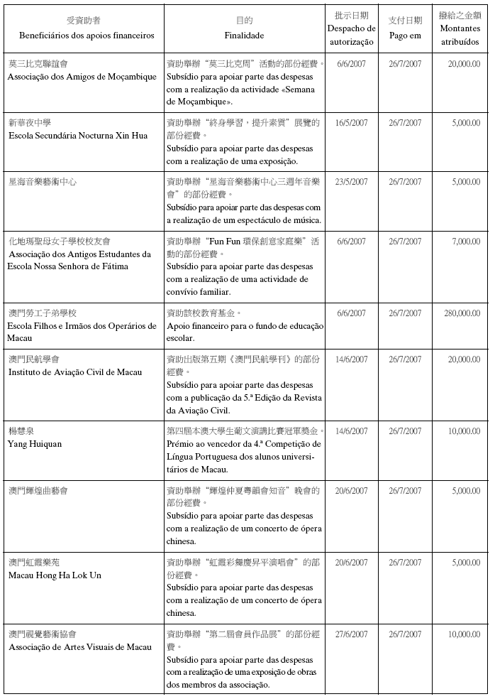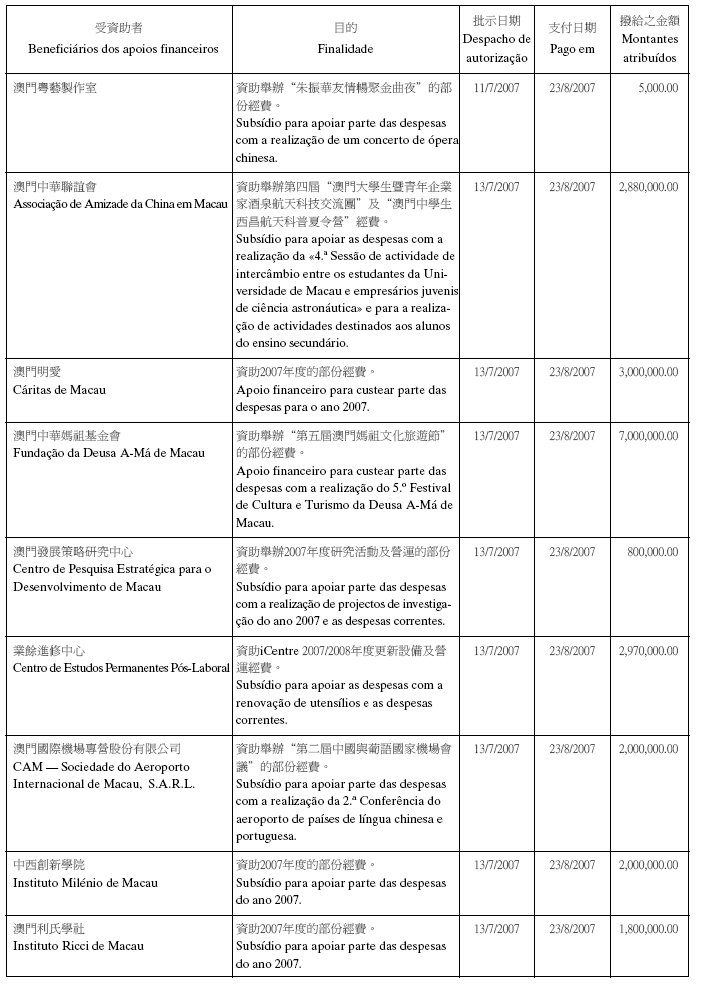 根據八月二十六日第54/GM/97號批示關於撥給私人和私人機構財政資助的有關規定,澳門基金會現公佈二零零七年第三季度的資助名單:
