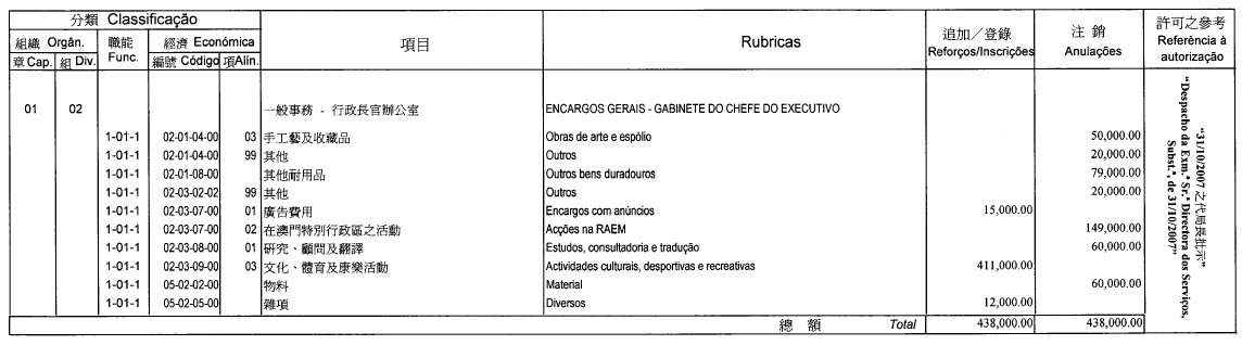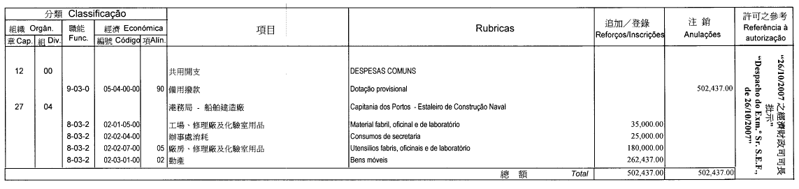 根據三月十七日第6/2006號行政法規第四十一條,以及第347/2006號行政長官批示附件I第八款規定,現刊登有關二零零七年度澳門大賽車獨立預算之第五次修改,該修改獲社會文化司司長在二零零七年十月九日批示核准: