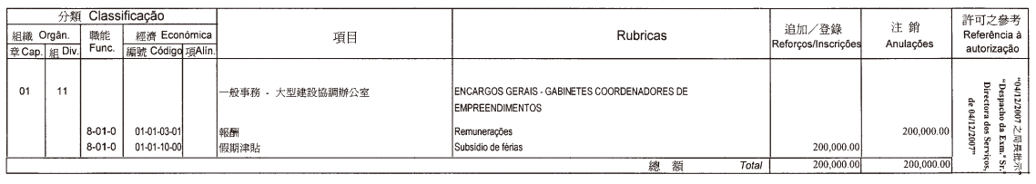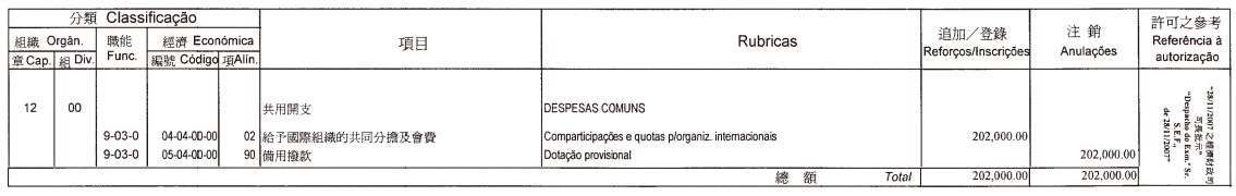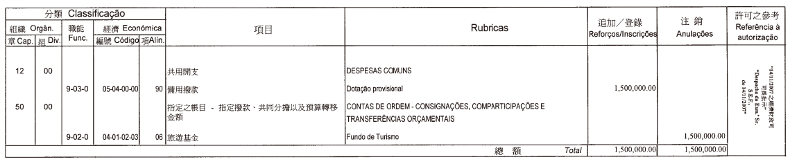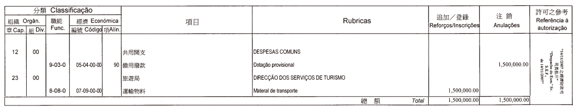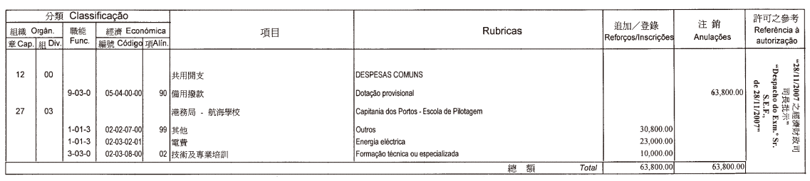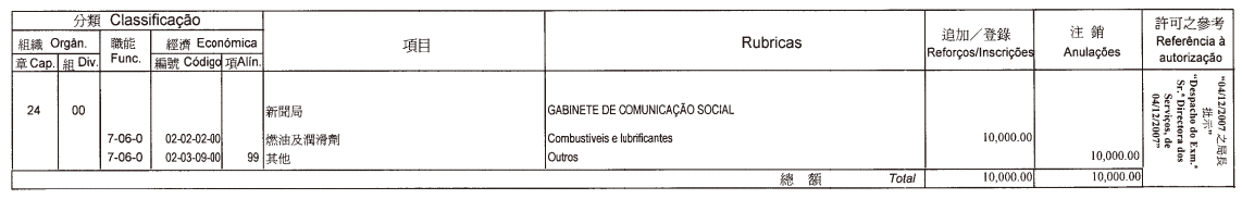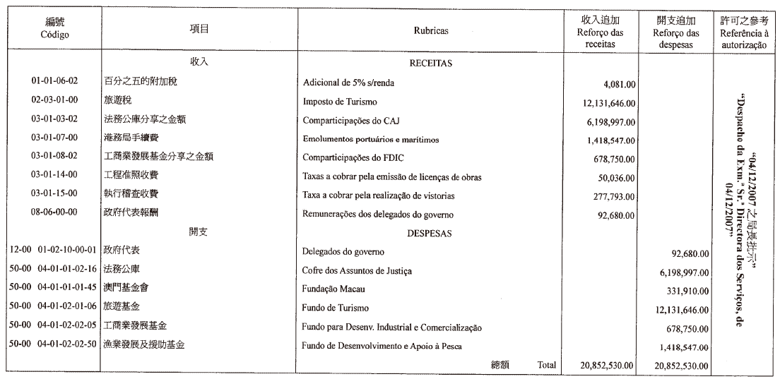 根據第12/2007號行政法規第二十四條及第6/2006號行政法規第三十九條第三款及第四十一條的規定,茲公佈經由審計長於二零零七年十二月三日批示核准的審計署二零零七年度本身預算之第三次修改: