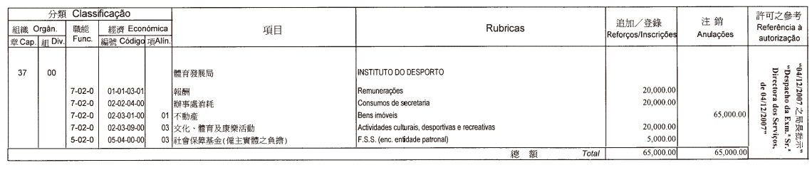 根據四月二十四日第6/2006號行政法規第四十一條的規定,現刊登經社會文化司司長二零零七年十一月二十一日批示核准的體育發展基金二零零七年度本身預算第十次修改:
