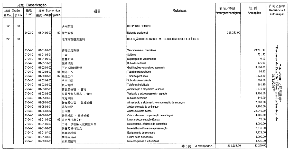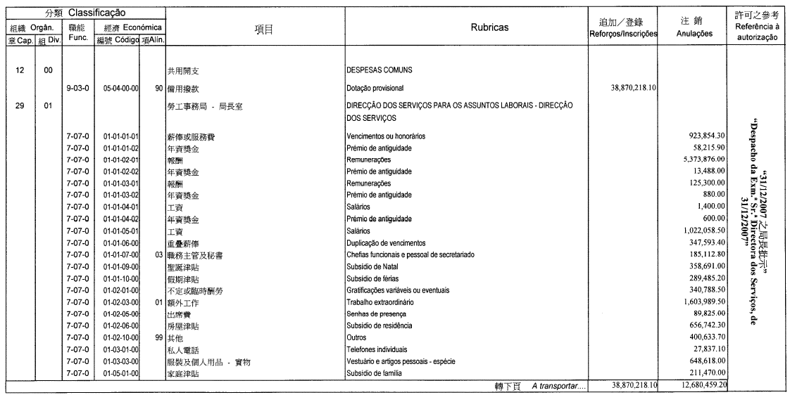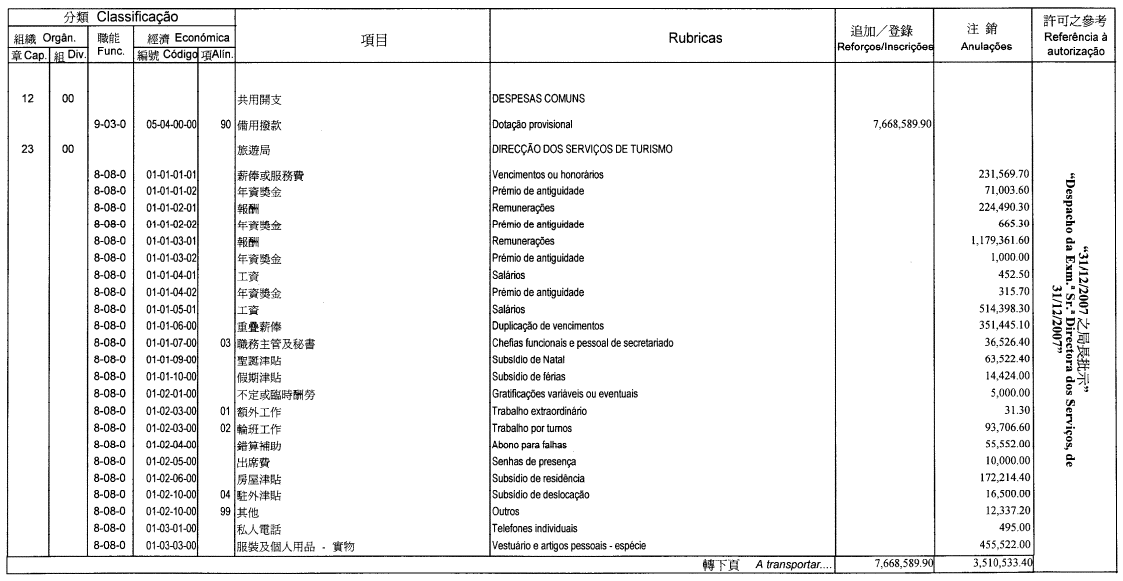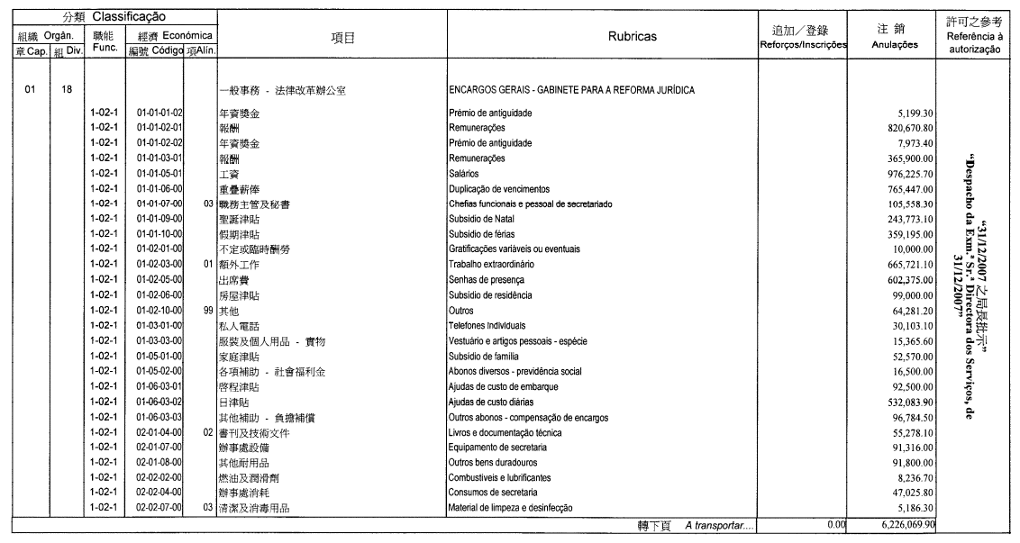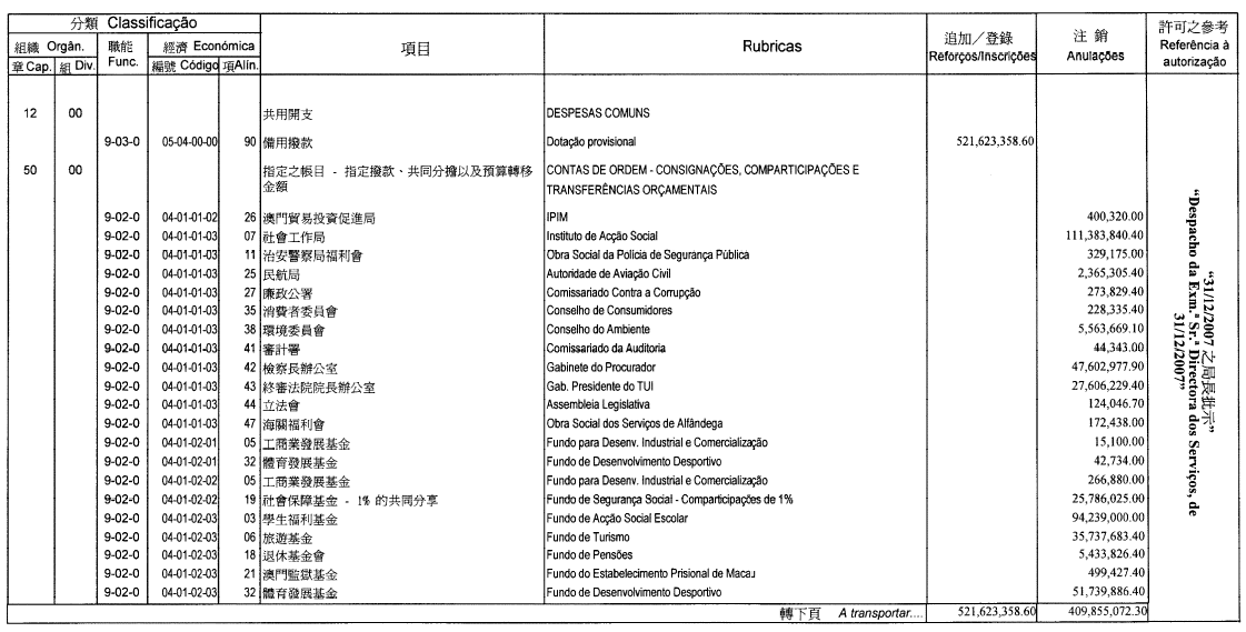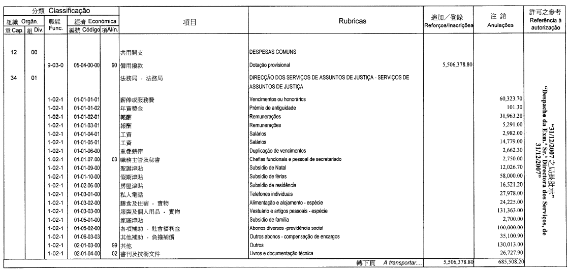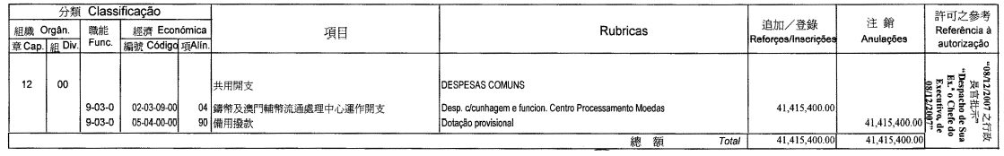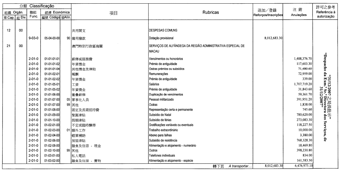 根據第6/2006號行政法規第四十一條的規定,茲公佈下列(澳門特別行政區財政預算/二零零七)款項轉帳,該轉帳按第347/2006號行政長官批示第二款規定所 核准: