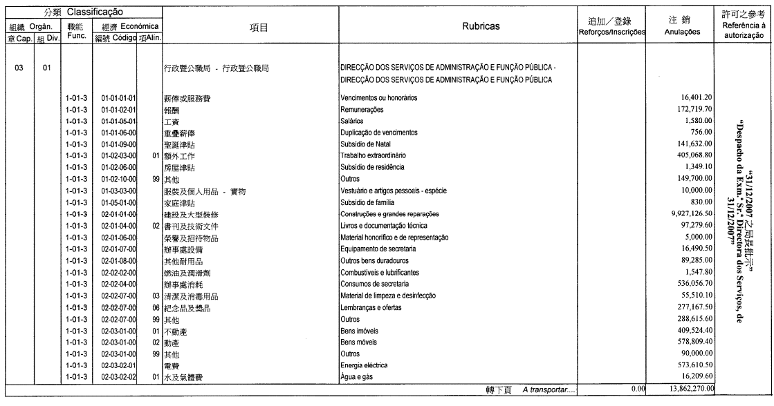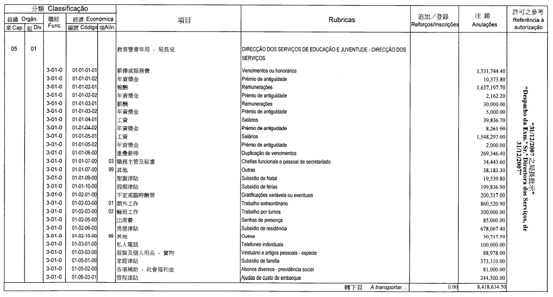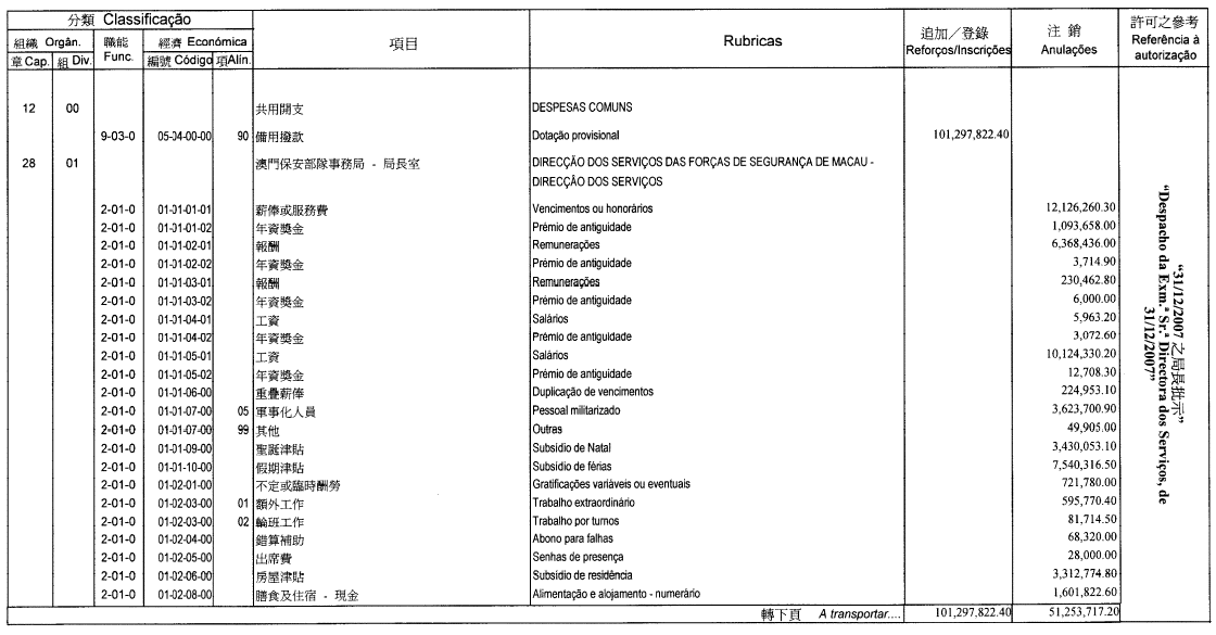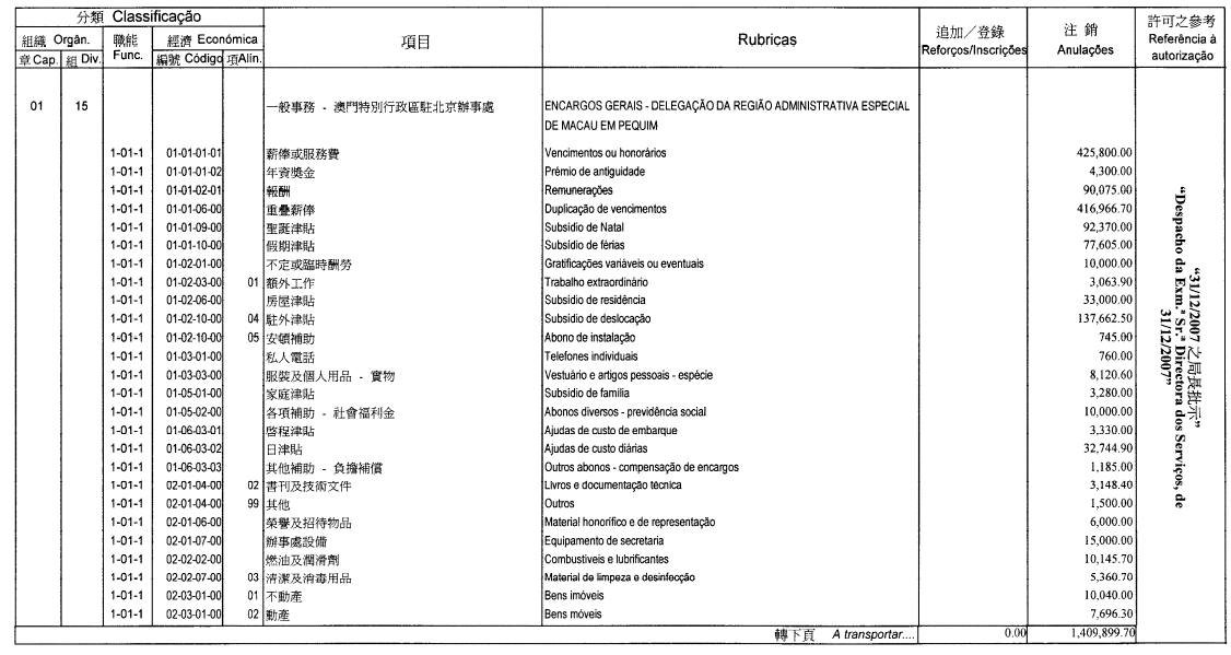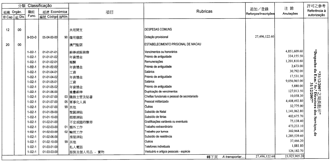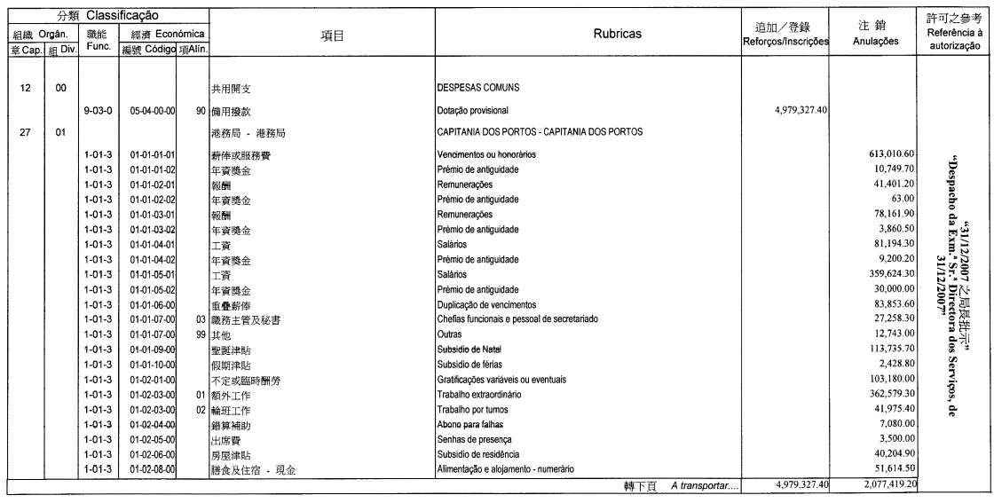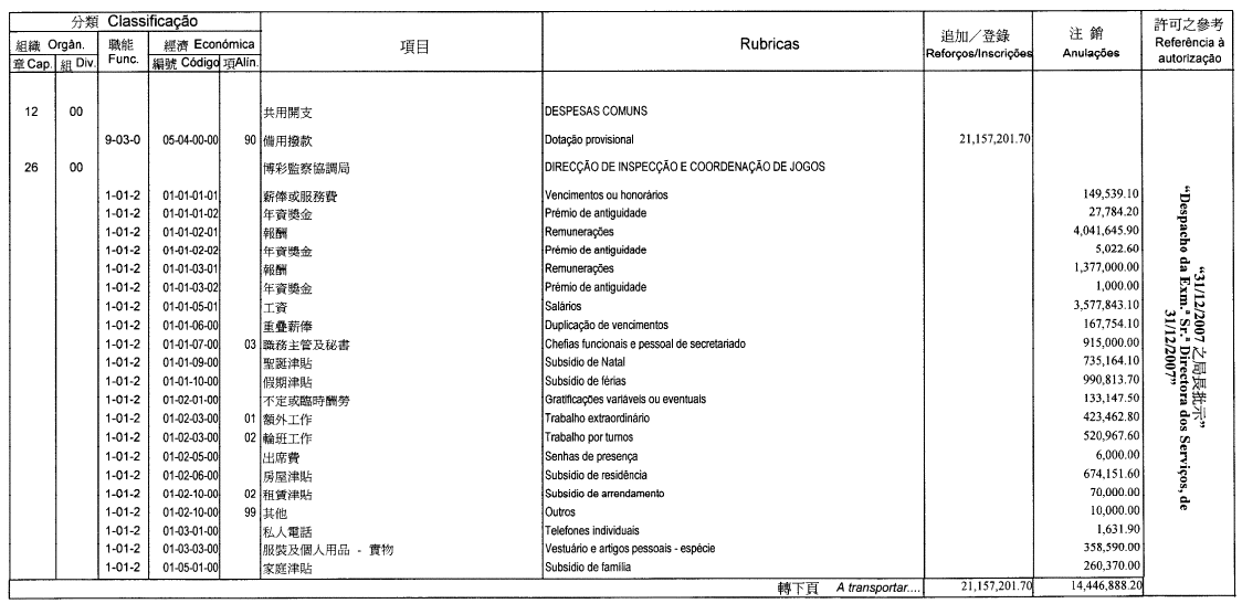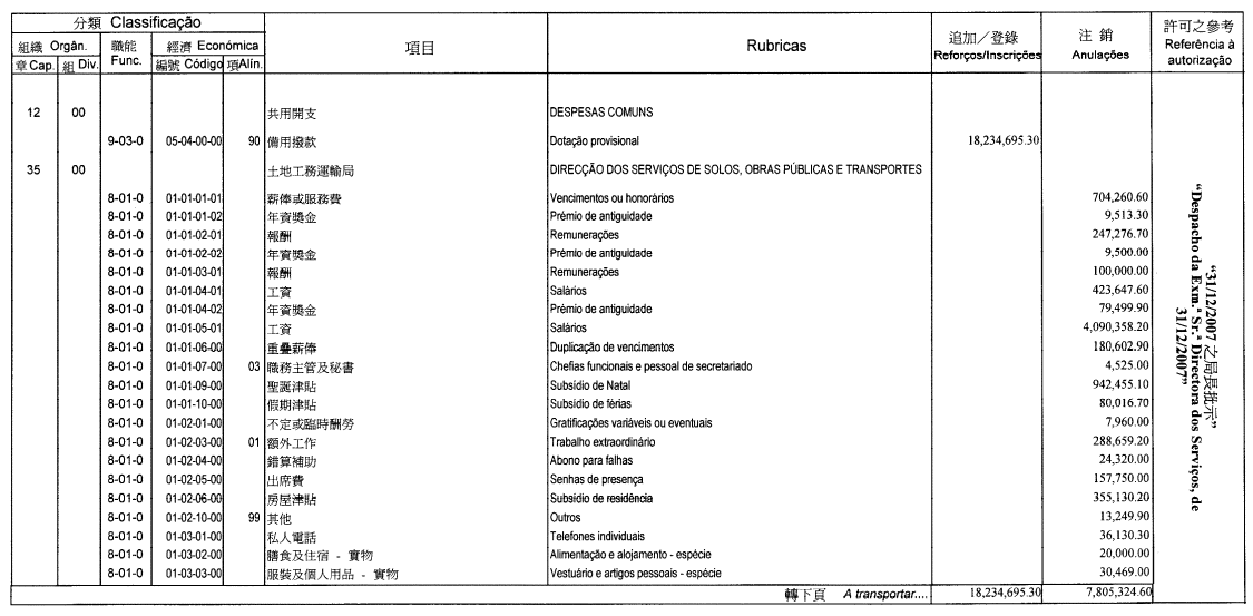 根據第6/2006號行政法規第四十一條的規定,茲公佈下列(澳門特別行政區財政預算/二零零七)款項轉帳,該轉帳按第347/2006號行政長官批示第二款規定所 核准: