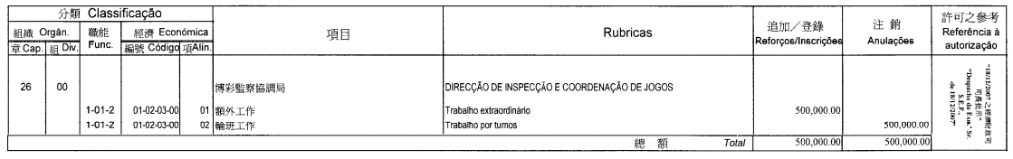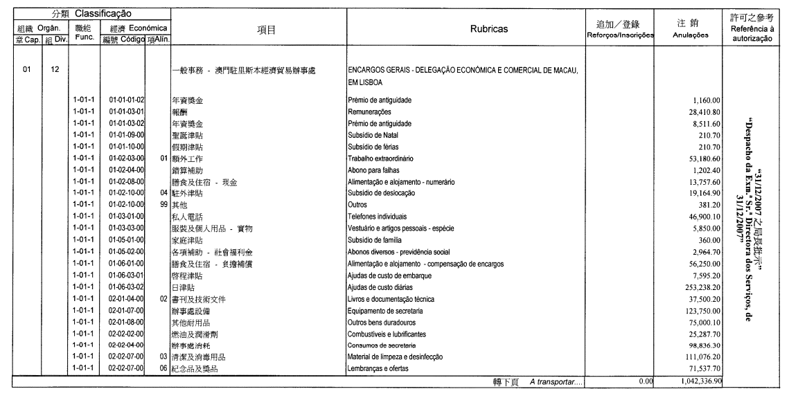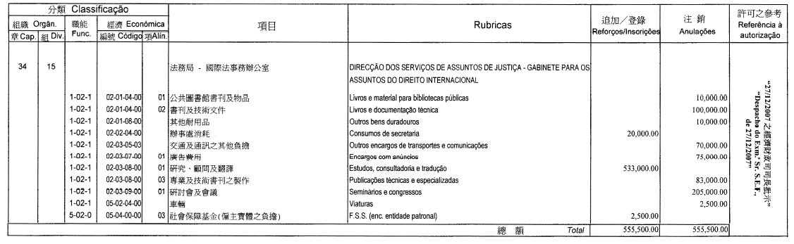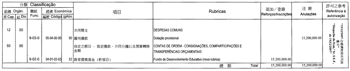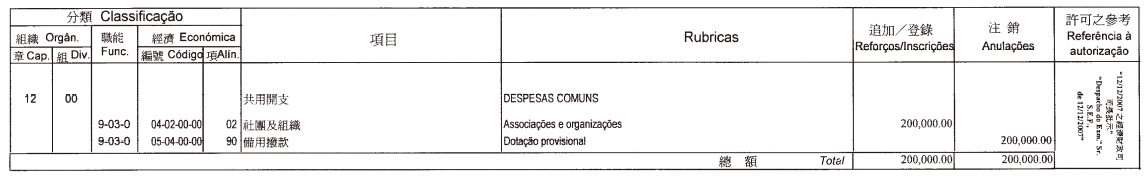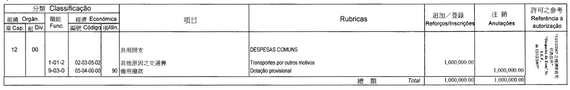 根據刊登於十二月二十九日《澳門特別行政區公報》第五十二期第一組(第三副刊)的第10/2006號法律第十條第二款規定,對本財政年度澳門特別行政區財政預算第一章第七組經常開支職能分類8-01-0經濟分類04-01-05-00-06,項目為“經常轉移——公營部門——其他——中國與葡語國家經貿合作論壇常設秘書處輔助辦公室”的整體款項分配,作出經第347/2006號行政長官批示第二款規定所核准的修改,茲公布如下: