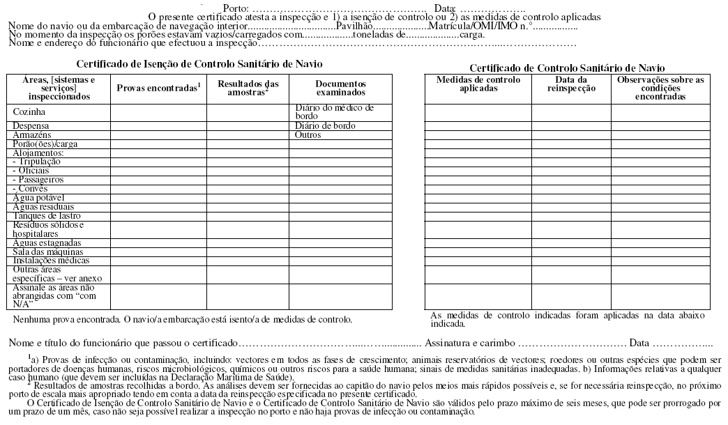 MODELO DE CERTIFICADO DE ISENÇÃO DE CONTROLO SANITÁRIO DE NAVIO/CERTIFICADO DE CONTROLO SANITÁRIO DE NAVIO