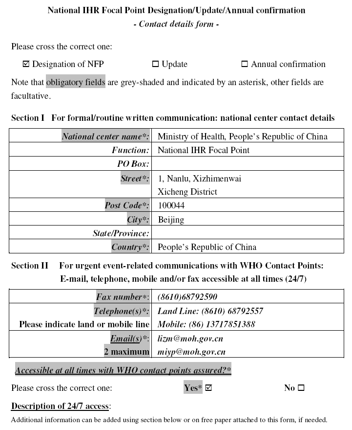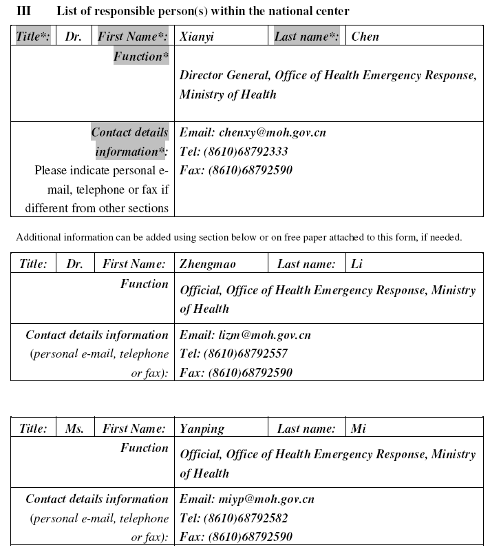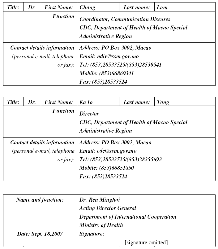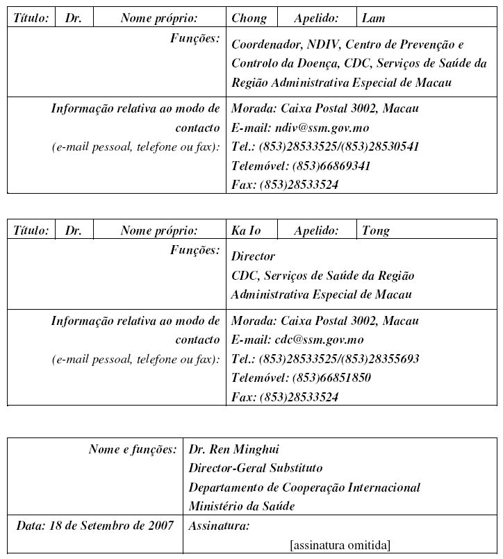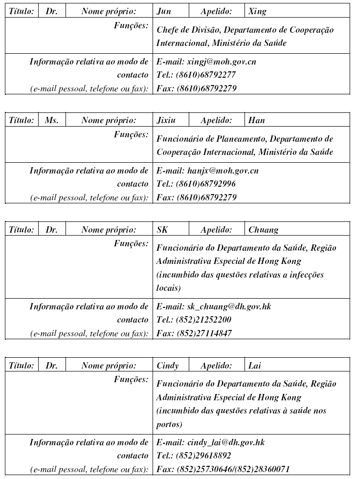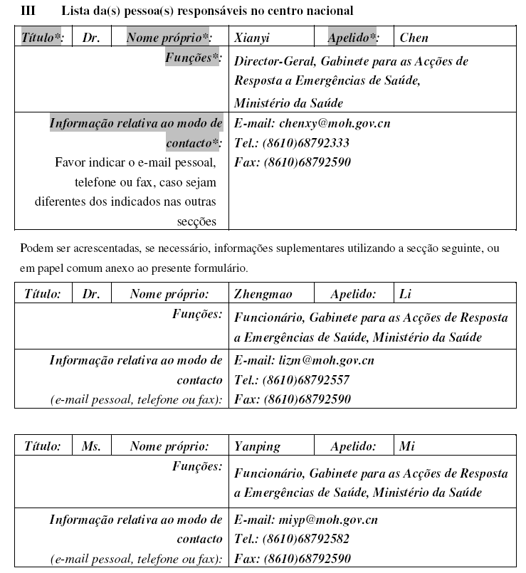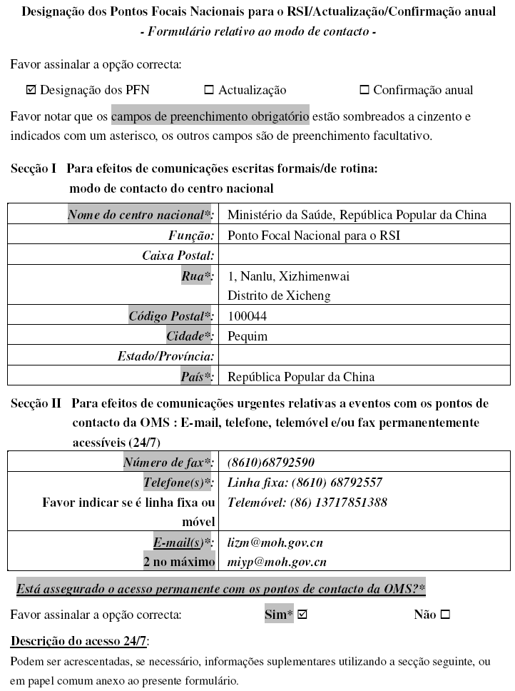 - — A parte útil do formulário relativo à designação do Ponto Focal Nacional da China e respectivo modo de contacto, em língua inglesa, tal como enviado ao Secretariado da OMS, acompanhada das respectivas traduções para as línguas chinesa e portuguesa.