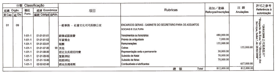 — De acordo com o disposto pelo artigo 41.º do Regulamento Administrativo n.º 6/2006, publicam-se as seguintes transferências de verbas (OR/2008), autorizadas nos termos do n.º 2 do Despacho do Chefe do Executivo n.º 347/2006: