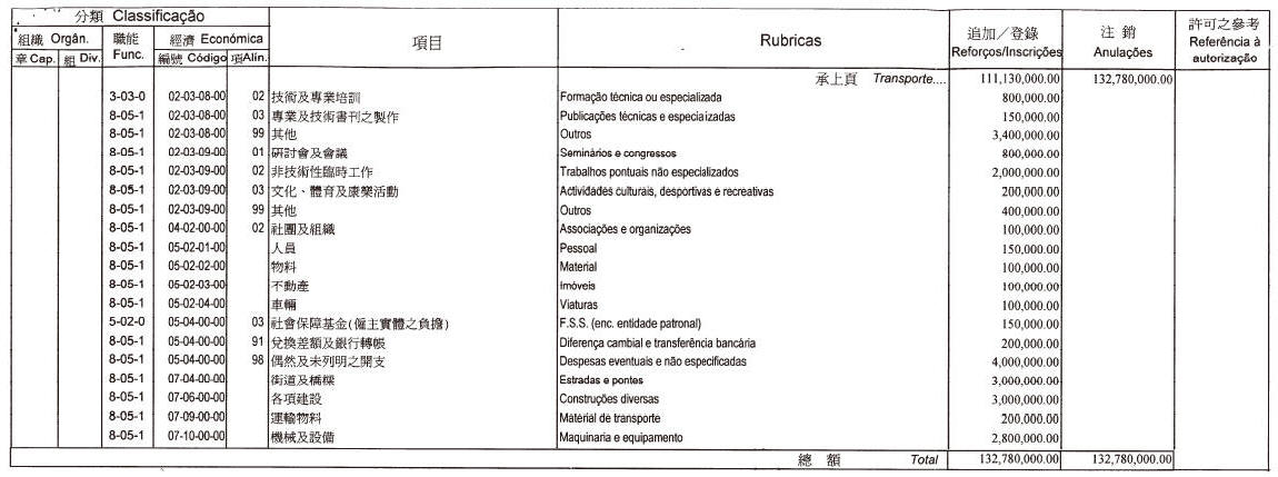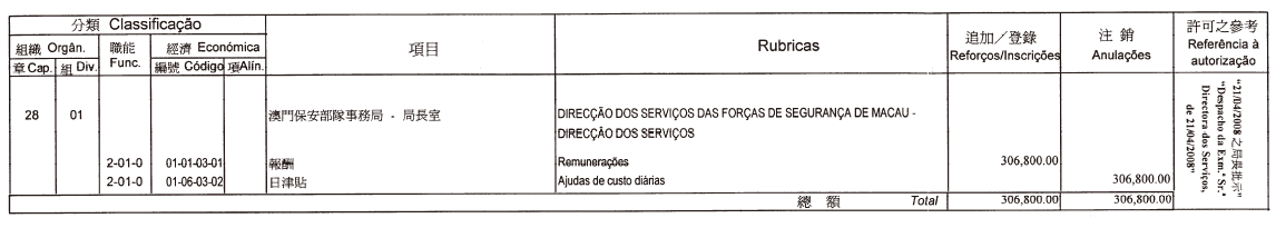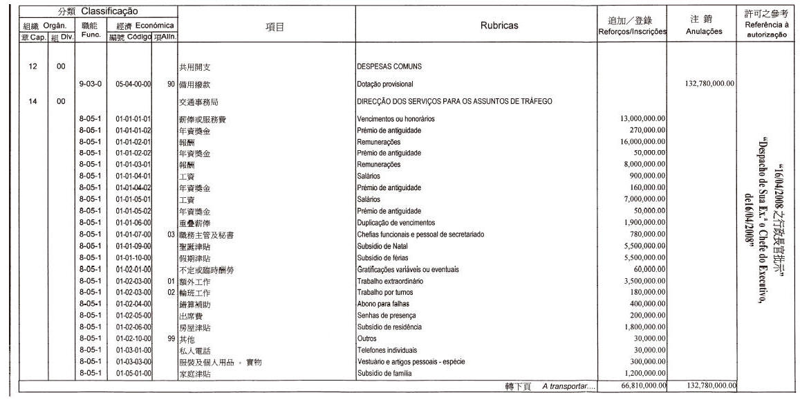 根據第31/2000號行政法規第二十三條及第6/2006號行政法規第三十九條第三款及第四十一條的規定,茲公佈經由廉政專員於二零零八年四月十六日所核准之廉政公署二零零八年度本身預算第一次之修改: