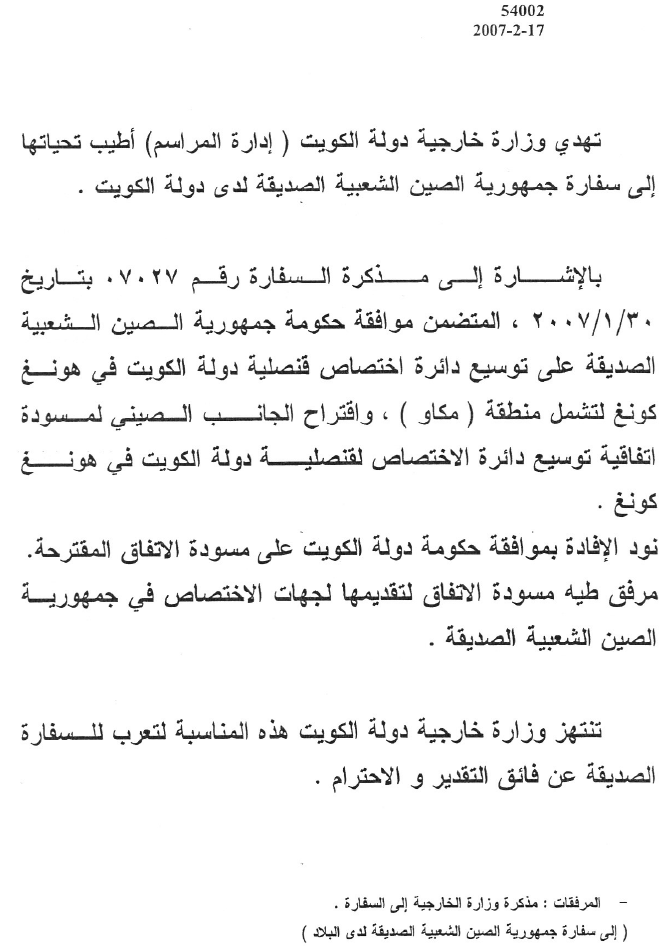 外交部的2007年2月17日54002號照會中提及,中華人民共和國政府同意科威特國駐香港總領事館領區擴大至澳門,並向科方提交了協議草案。