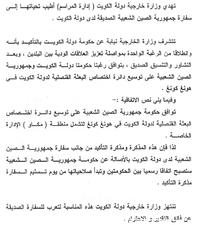 科威特國外交部謹代表科威特國政府確認,科威特國政府和中華人民共和國政府本著進一步發展兩國之間友好關係的共同願望,經過友好協商,就科威特國駐香港總領事館擴大領區範圍問題達成協議如下: