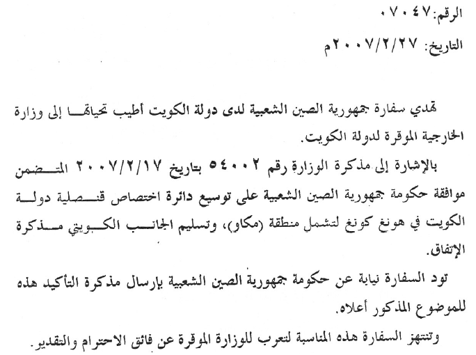 大使館在2007年1月30日07027號照會中提及,友好的中華人民共和國政府同意科威特國駐香港總領事館領區擴大至澳門,並就此提出了協議草案建議。